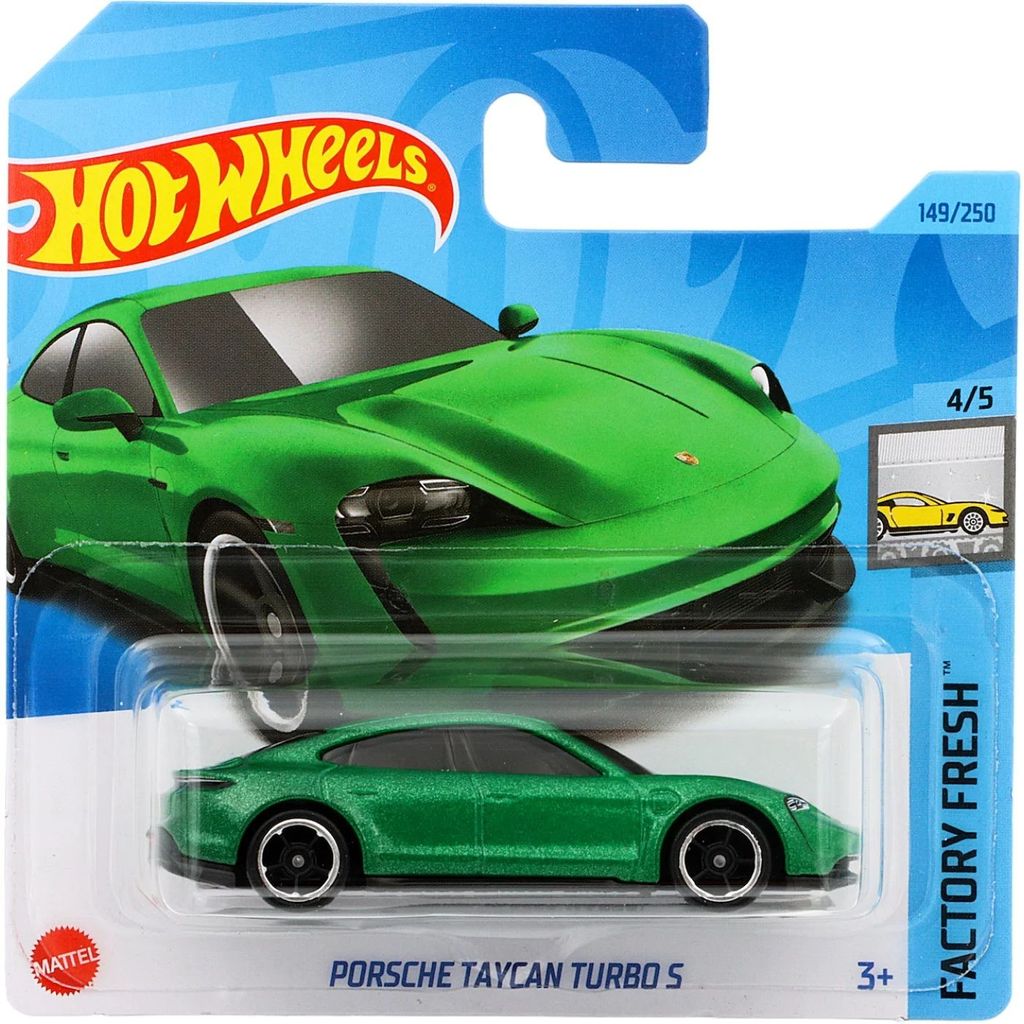 Porsche Taycan Turbo S fra Hot Wheels og Factory Fresh-serien, hvor denne legetøjsbil er bil nummer 4/5. Bilen er nummer 149/250 fra 2023 og har et kort kort (5785).