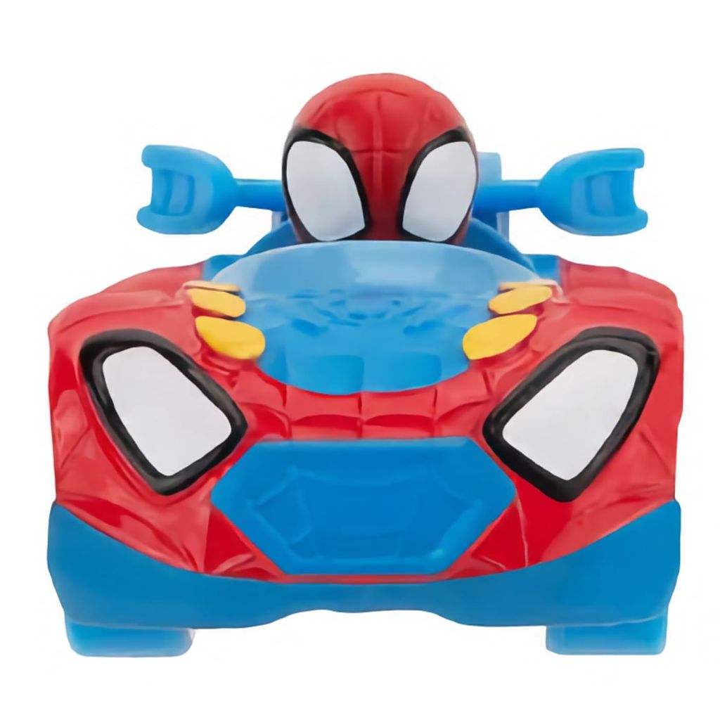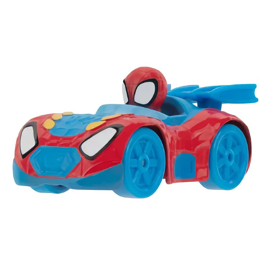 Spidey sidder i en rød og blå legetøjsbil, der er 7,3 cm lang. Bilen er en del af Amazing Metals-serien fra Jazwares og Disney Junior.
