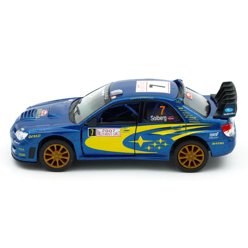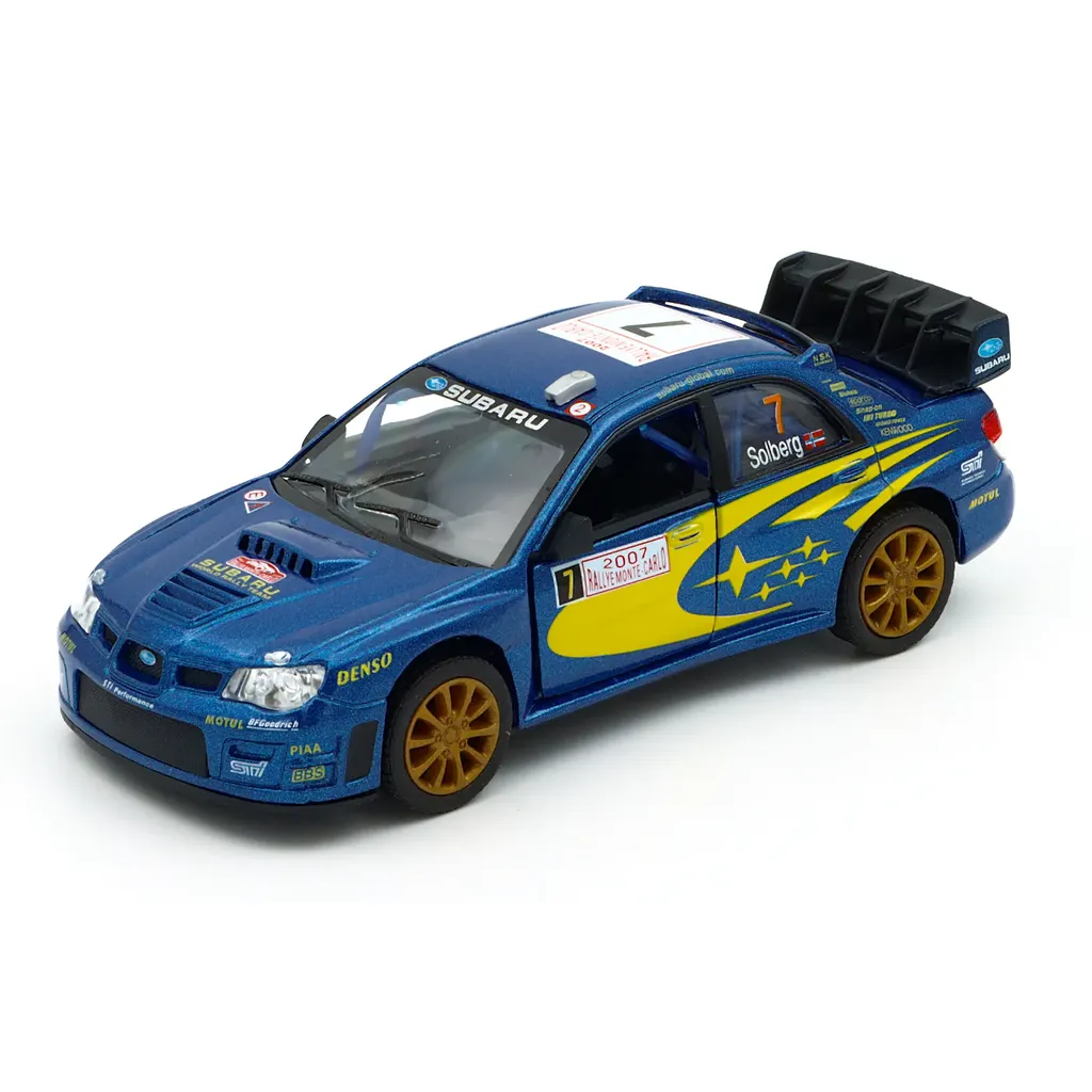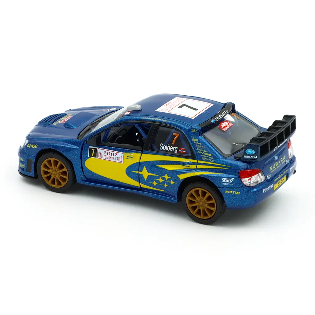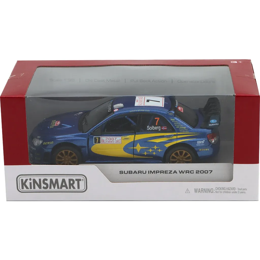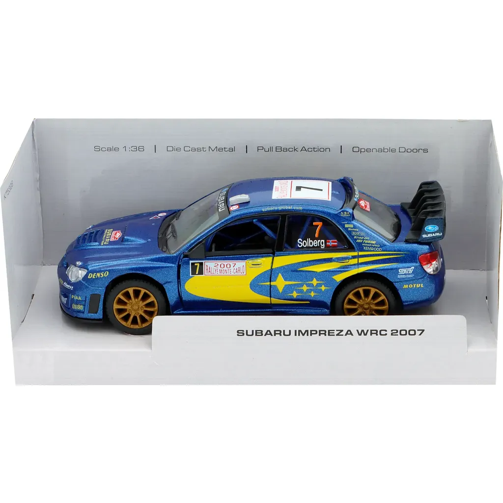 Subaru Impreza WRC 2007 (Petter Solberg #7) fra Kinsmart i skala 1:36 (længde 13 cm).