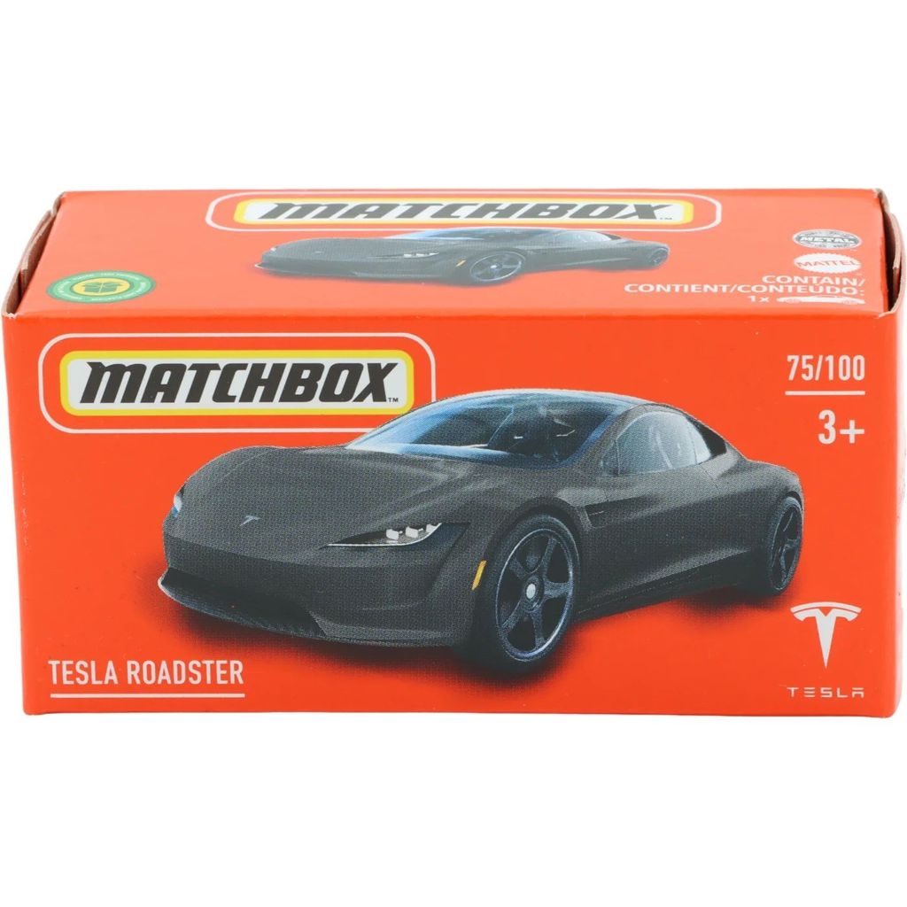 Tesla Roadster fra Matchbox og Power Grab-serien, hvor denne legetøjsbil er bil nummer 75/100. Bilen er inkluderet i E-case 2021.