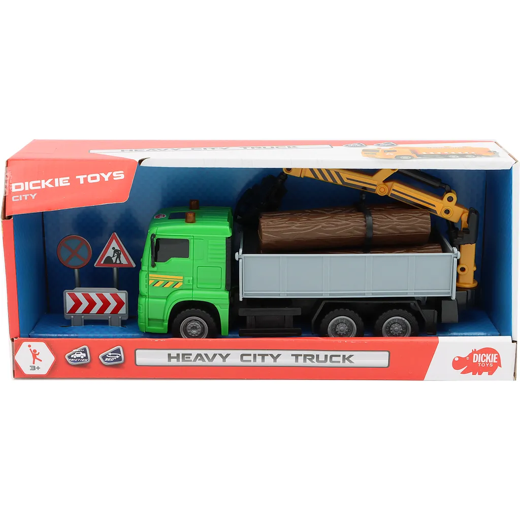 Grøn tømmerbil/lastbil/kranbil med fire træstammer på ladet fra Dickie Toys.