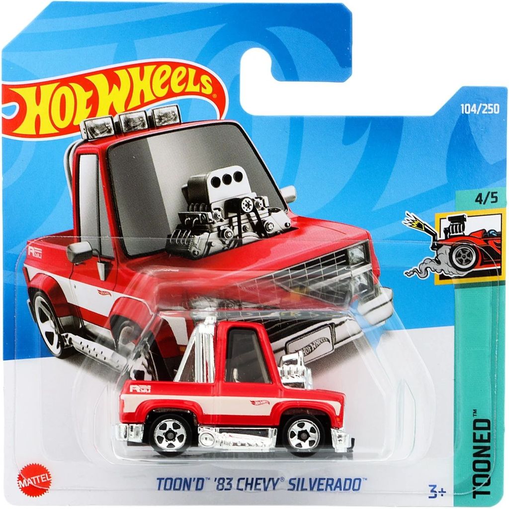 Toon?d ?83 Chevy Silverado fra Hot Wheels and the Tooned-serien, hvor denne legetøjsbil er bil nummer 4/5. Bilen er nummer 104/250 fra 2022 og har et kort kort (5785).