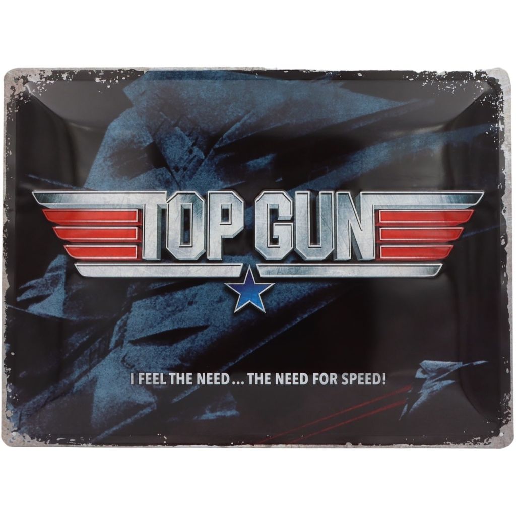 Tintallerken med Top Gun-motiv. Ud over Top Gun-logoet står der "I Feel the Need... Behovet for fart!".