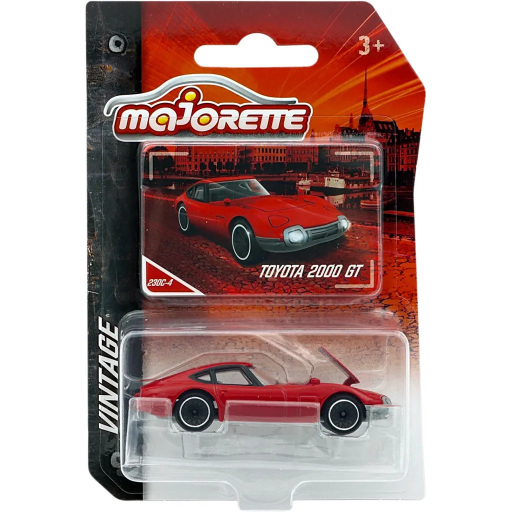 Rød Toyota 2000 GT fra Majorette og Vintage-serien. Bilen er 7,7 cm lang (skala 1:56).