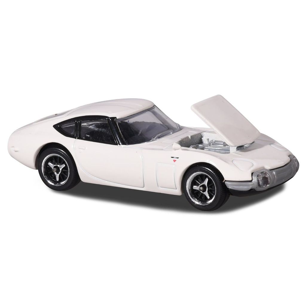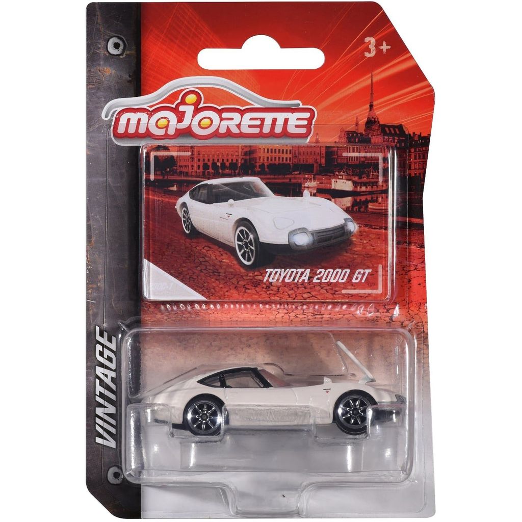 Hvid Toyota 2000 GT fra Majorette og Vintage-serien. Skalaen er 1:56, hvilket giver os en længde på 7,5 cm.