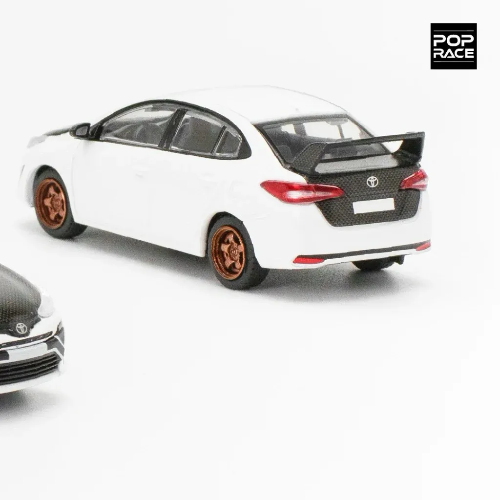Toyota GR Vios i hvid med sort motorhjelm fra Pop Race i skala 1:64 (ca. 7 cm).