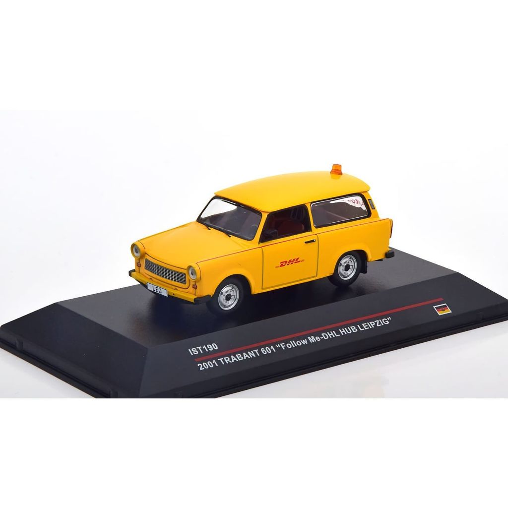 Bilens og modellens fulde navn, som også står på bundpladen, er: "IST190 2001 TRABANT 601 "Follow Me-DHL HUB Leipzig".