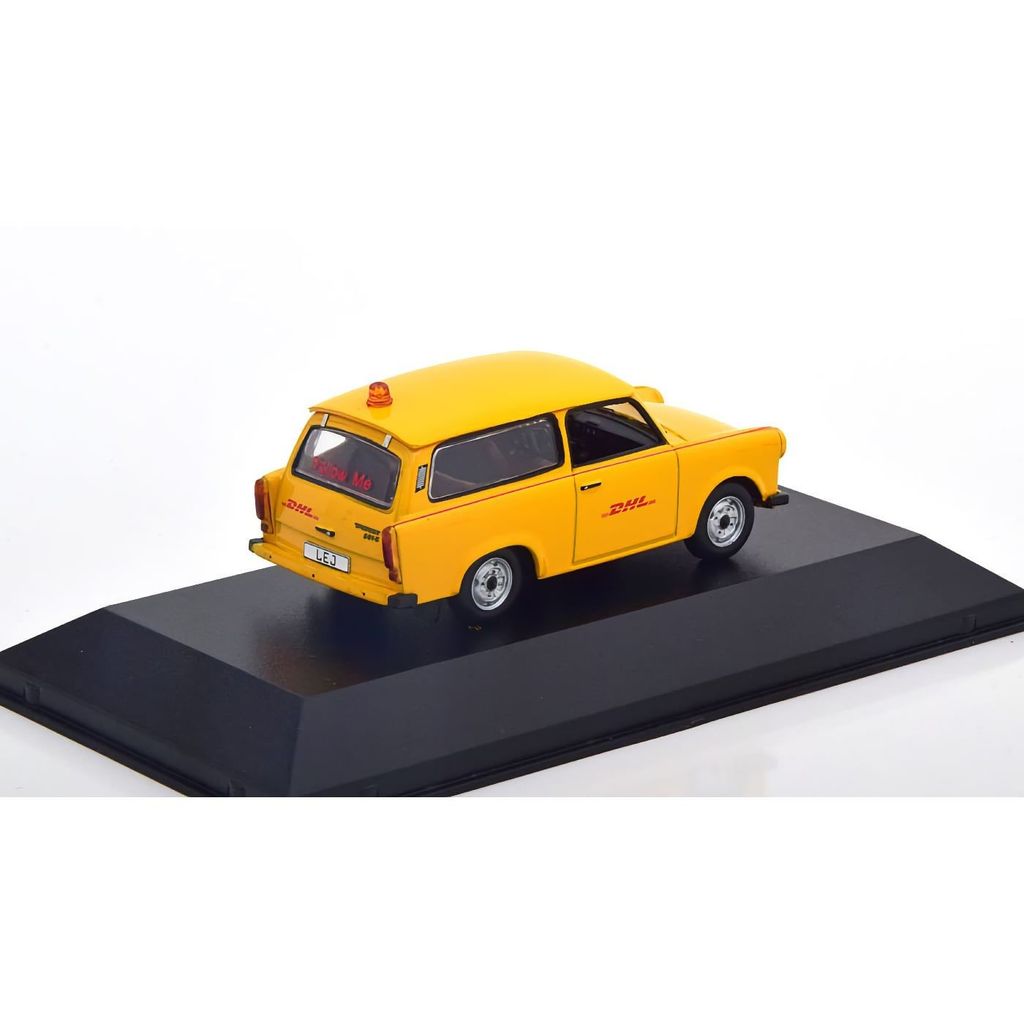 Trabanten er en DHL-bil i skala 1:43, hvilket giver os ca. 8,5 cm modelbil. Modellen er produceret af IST Models.