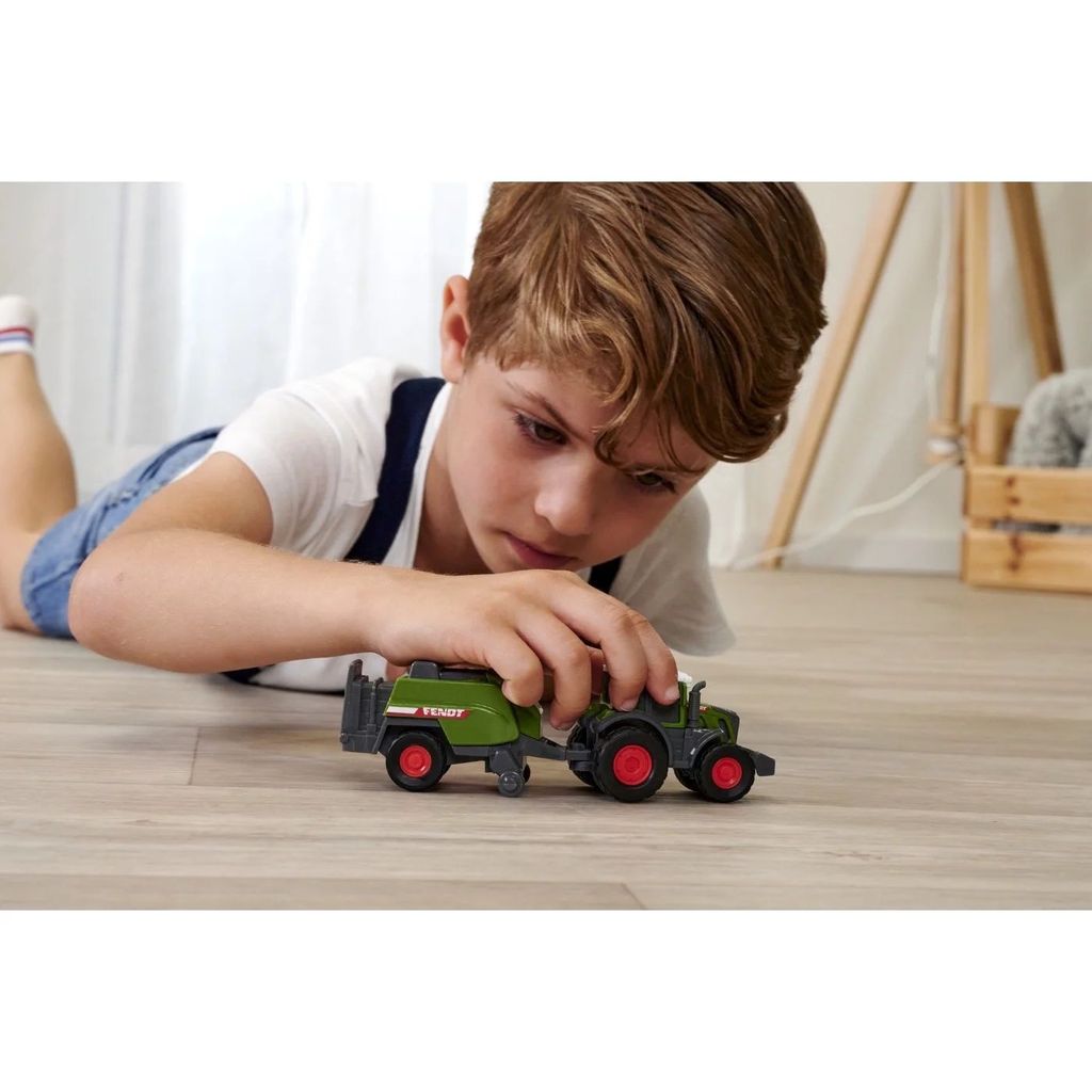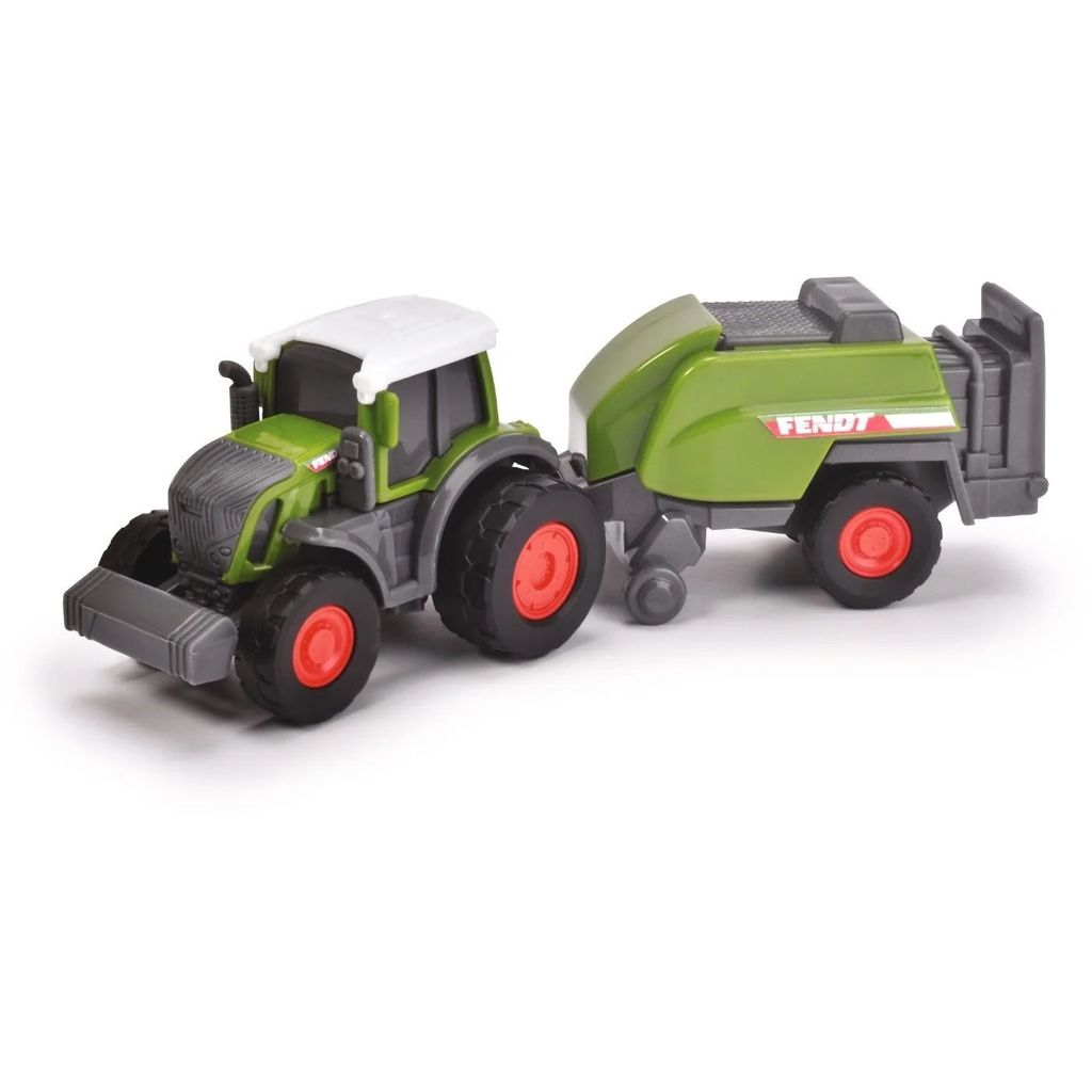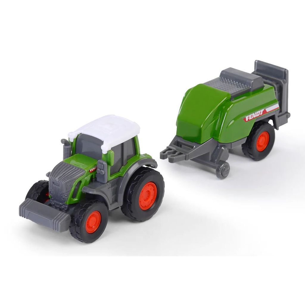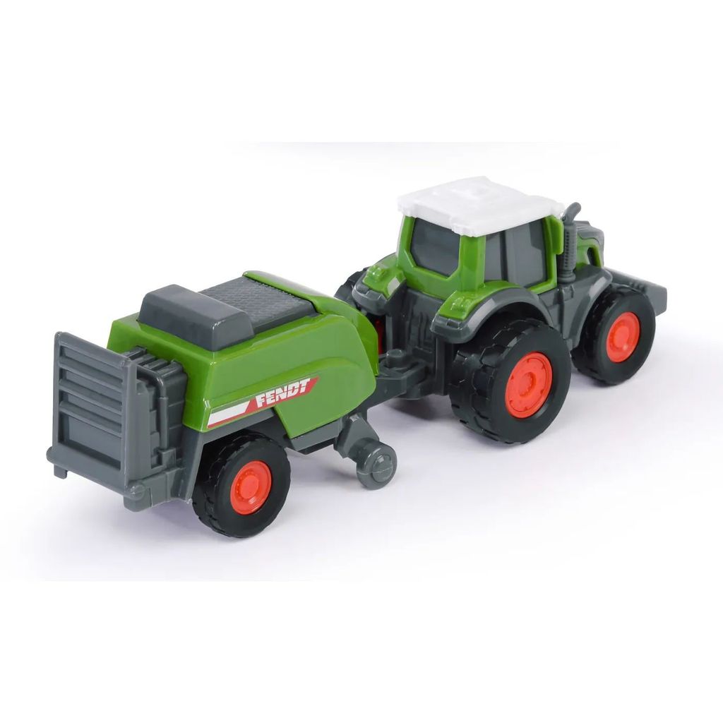 Fra Dickie Toys og Fendt Micro Farmer-serien tilbyder vi her en grøn traktor af mærket Fendt med en ballepresser.
