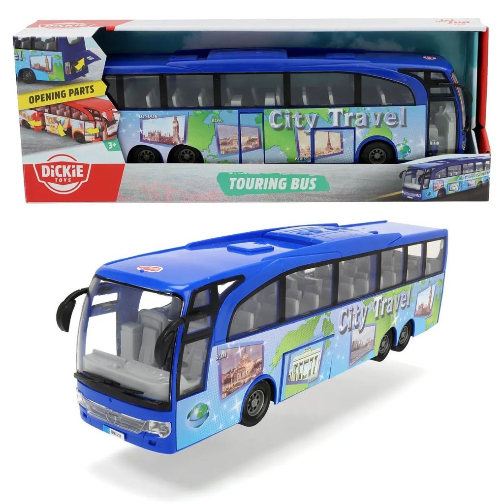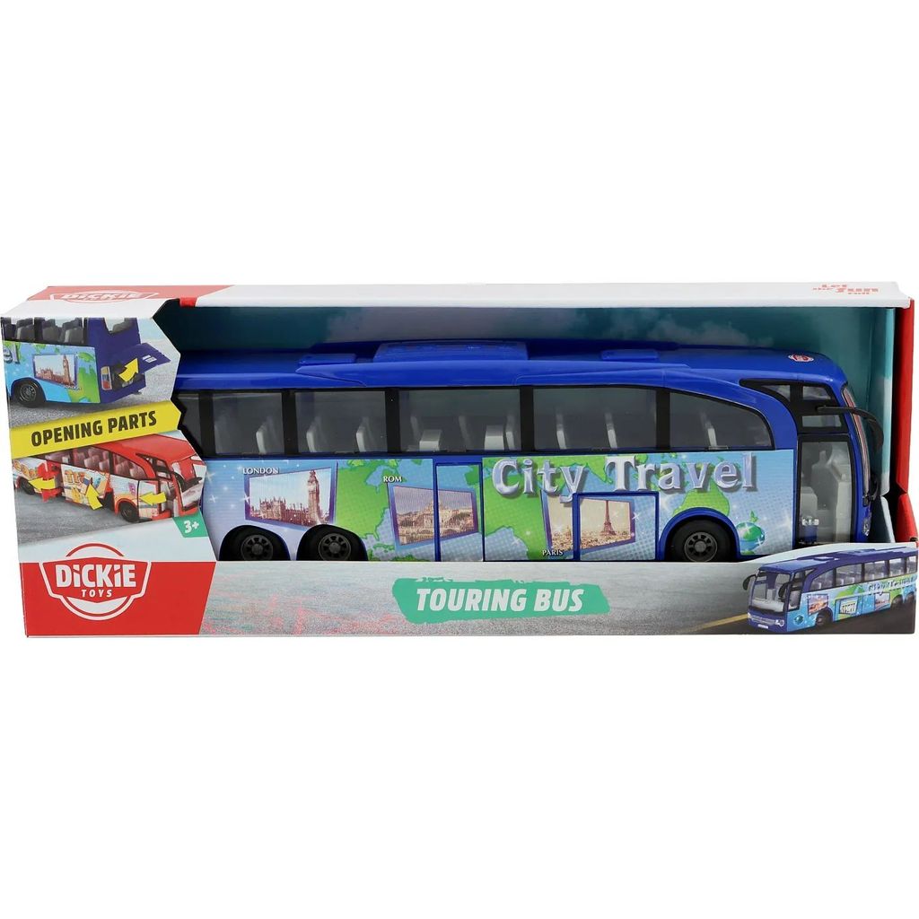Touring Bus fra Dickie Toys er en 30 cm lang turistbus til transport af turister til byen. Den blå bus har et bytema med teksten "City Travel" på siden.