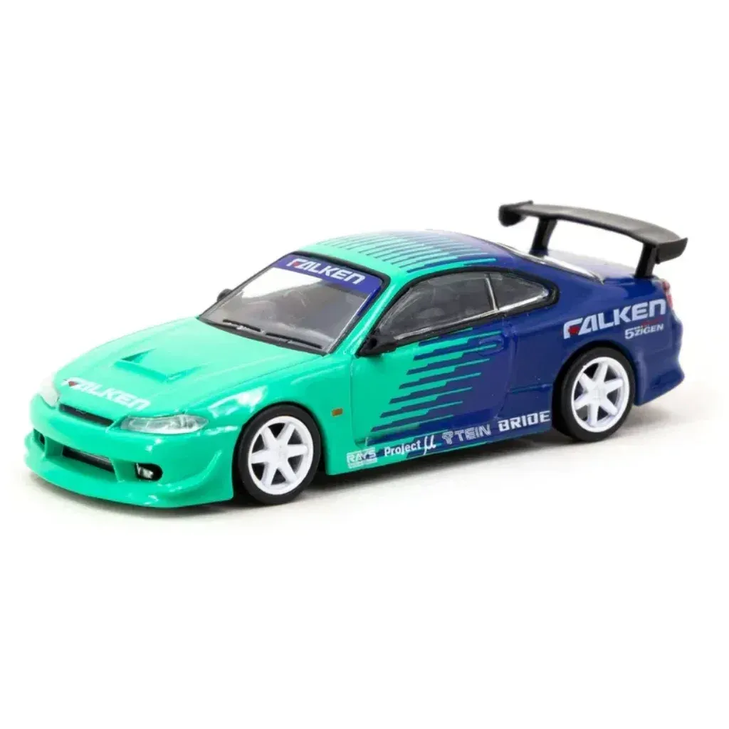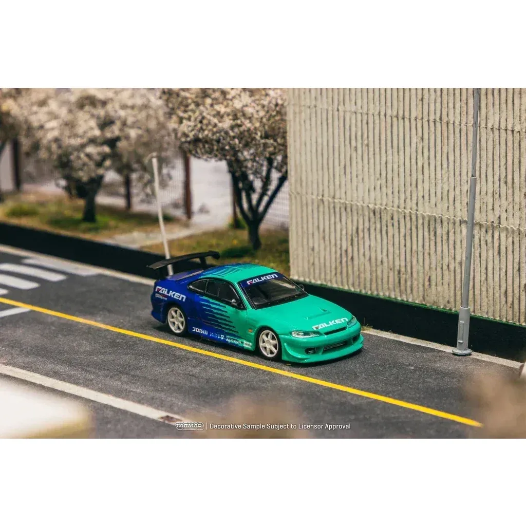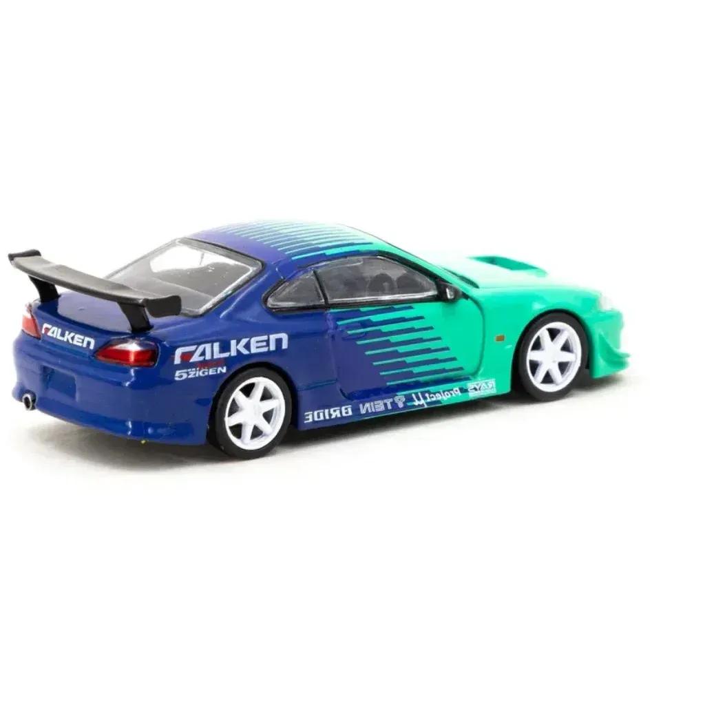 Blå og grøn VERTEX Nissan Silvia (S15) med FALKEN-lakering fra modelbilproducenten Tarmac Works og GLOBAL64-serien i skala 1:64 (ca. 7 cm).