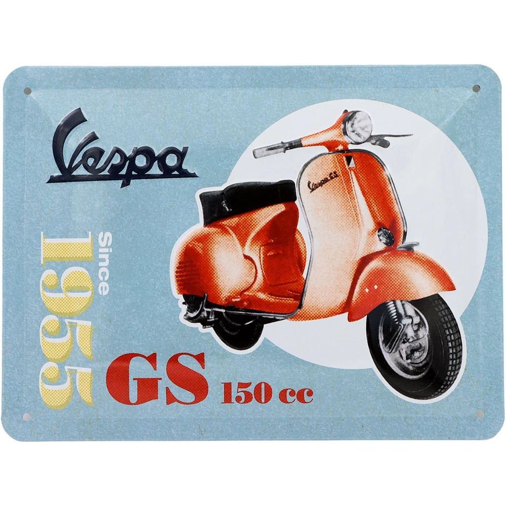 Blikskilt med motiv af en rød/orange Vespa GS 150 cc. Skiltet har teksten "Vespa GS 150 cc - Since 1955.