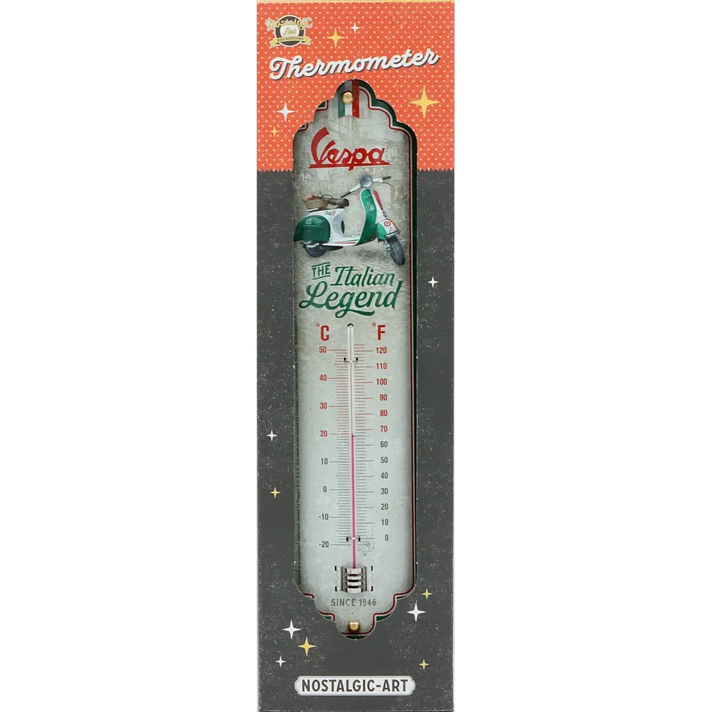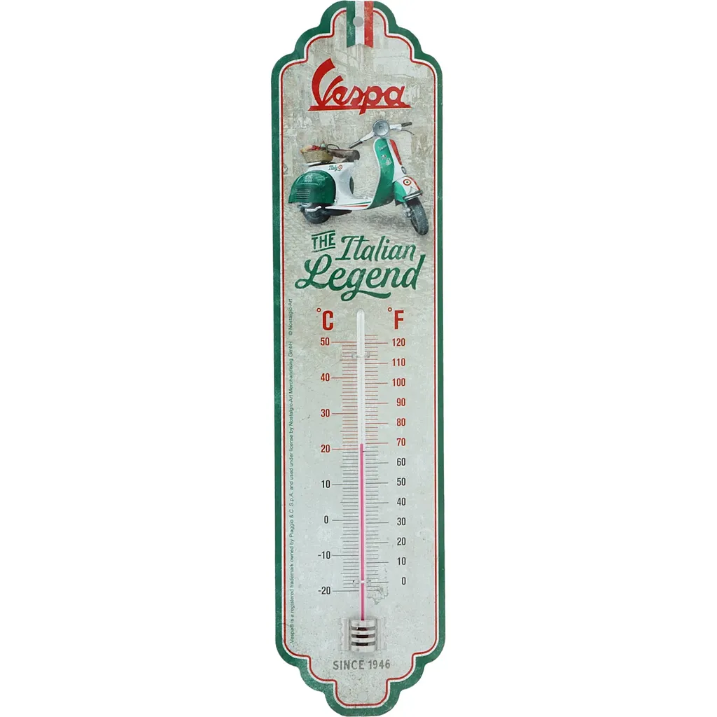 Vespa-termometer i metal. Vespa The Italian Legend er budskabet på termometeret.