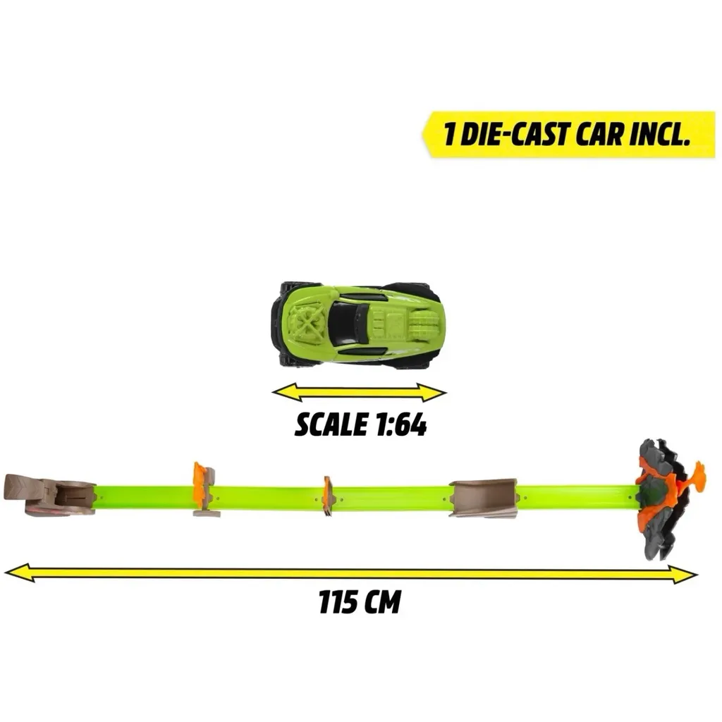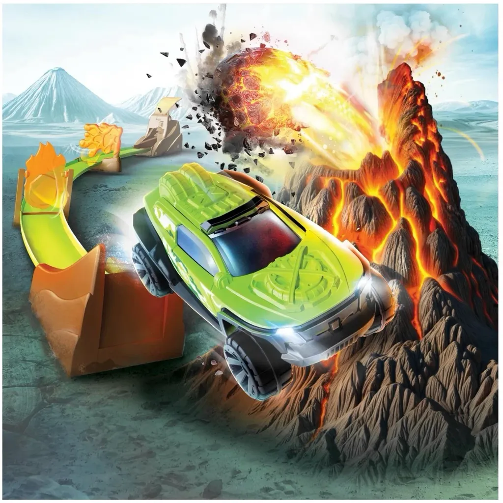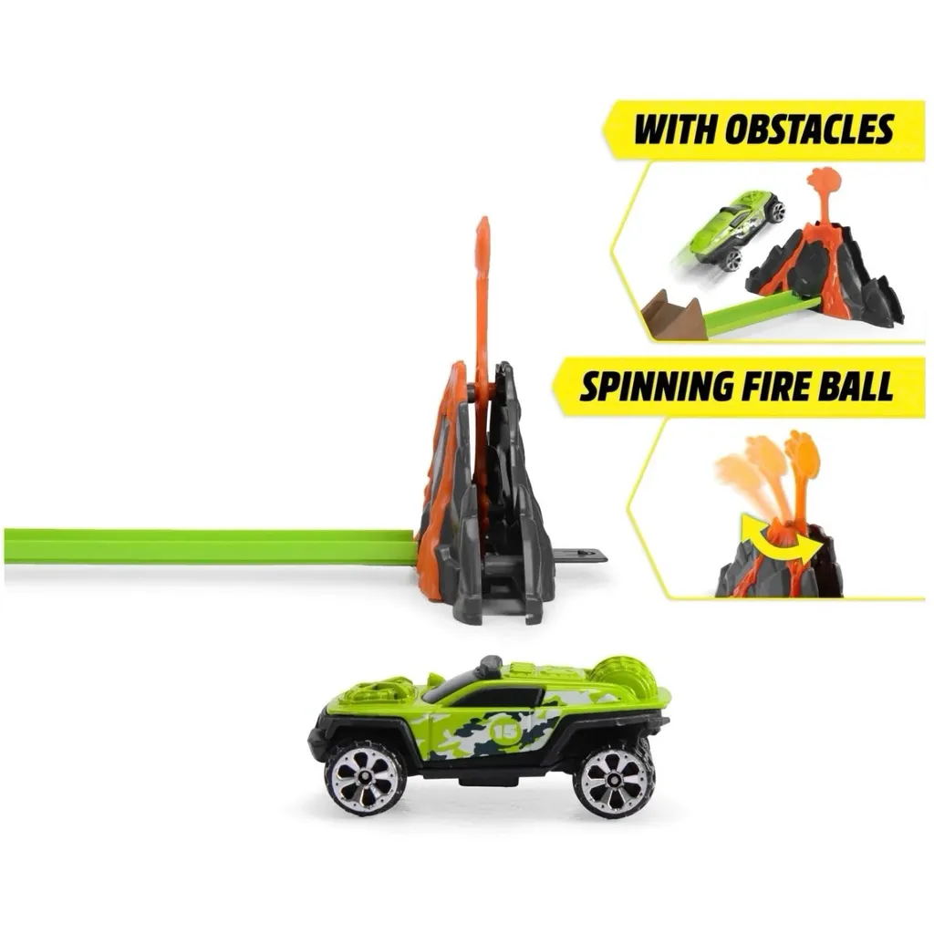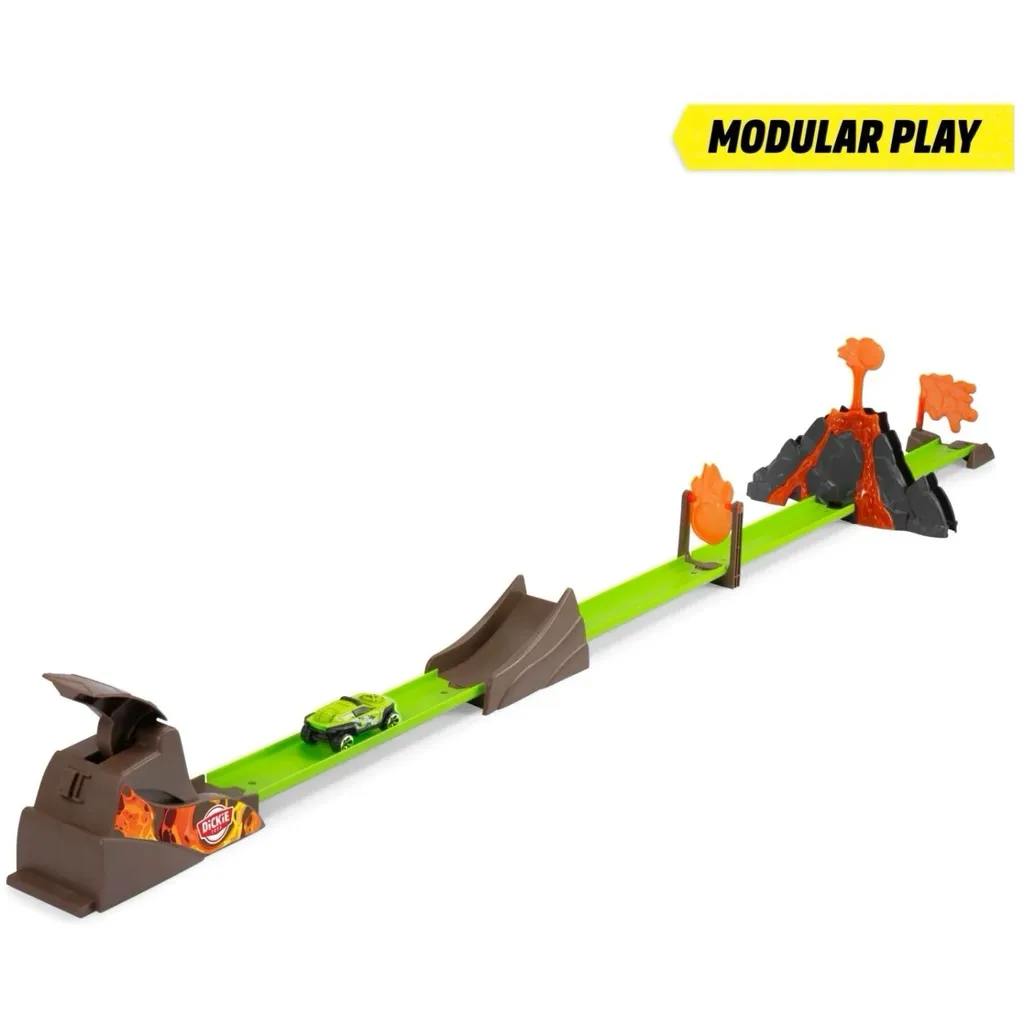 Volcano Launcher track set fra Dickie Toys indeholder en grøn legetøjsbil.
