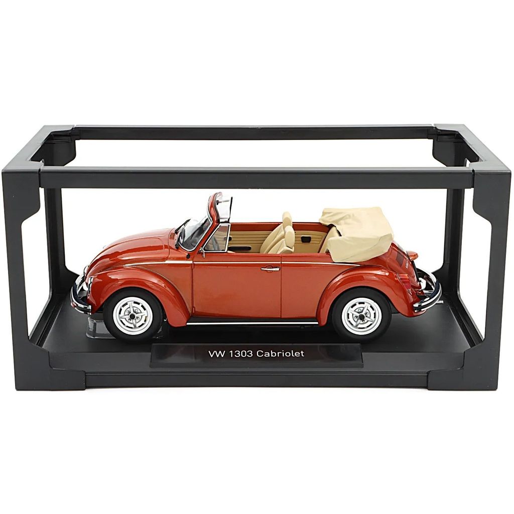 Beetlen står på en sort bundplade med modelnavnet "Volkswagen 1303 Cabriolet" i sølvtekst.
