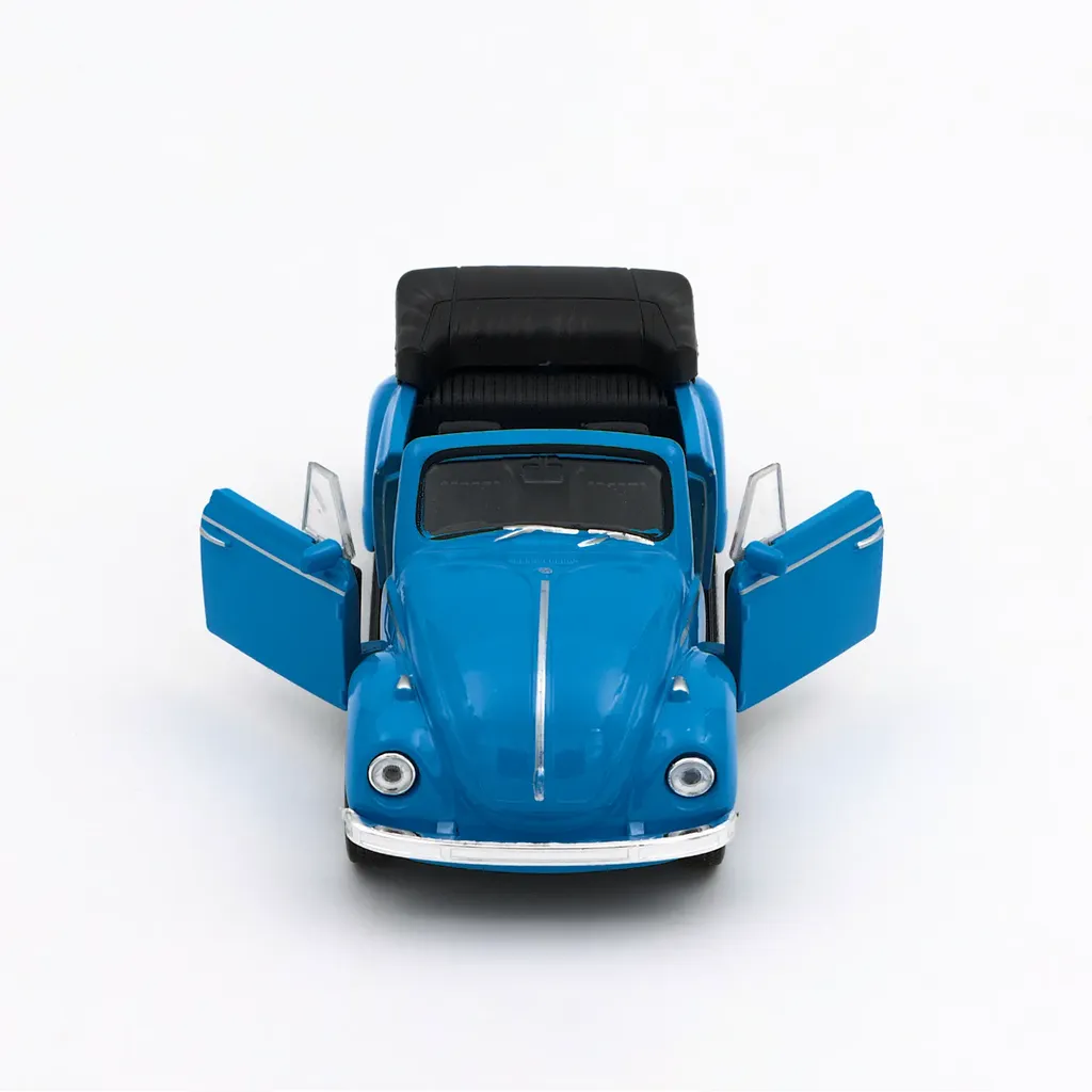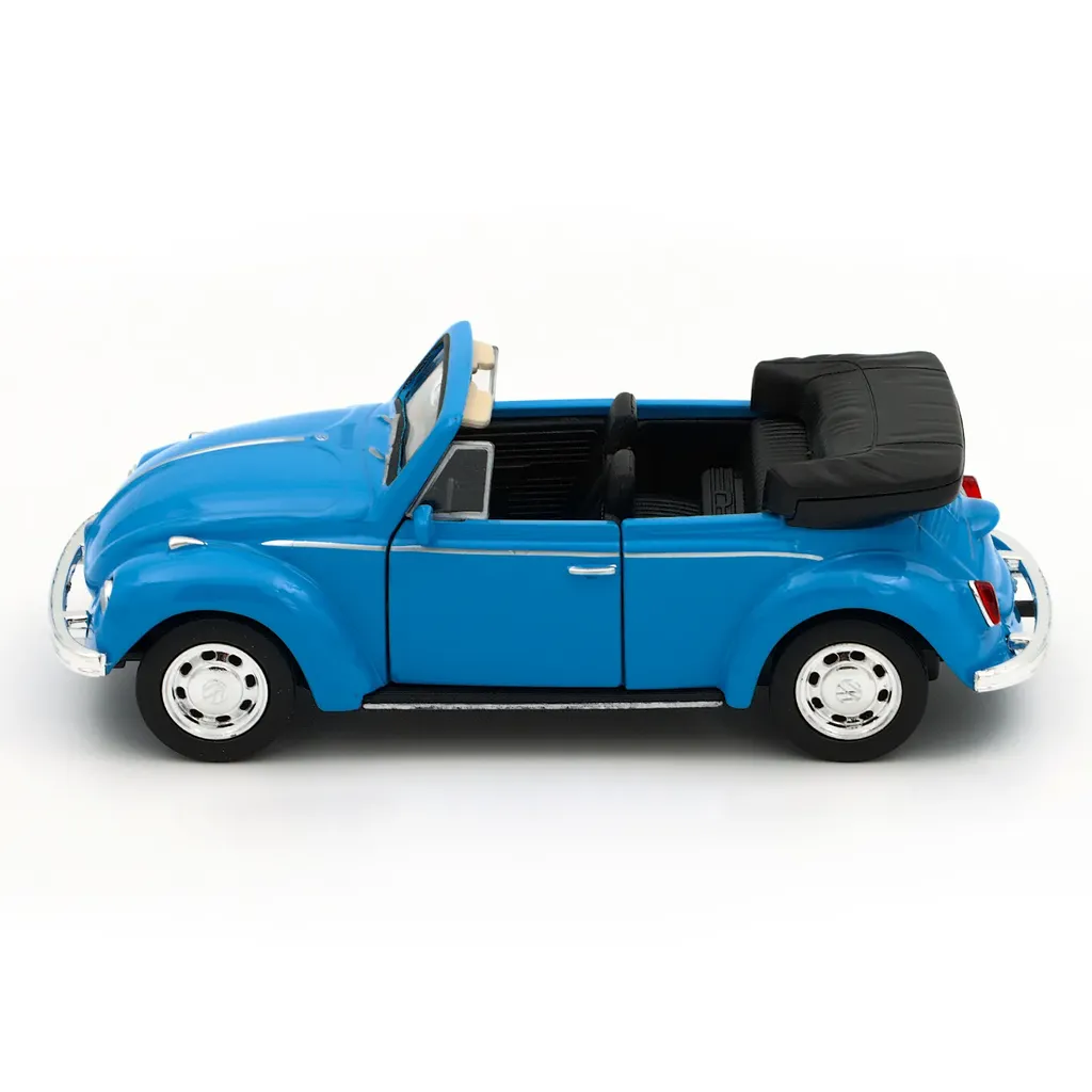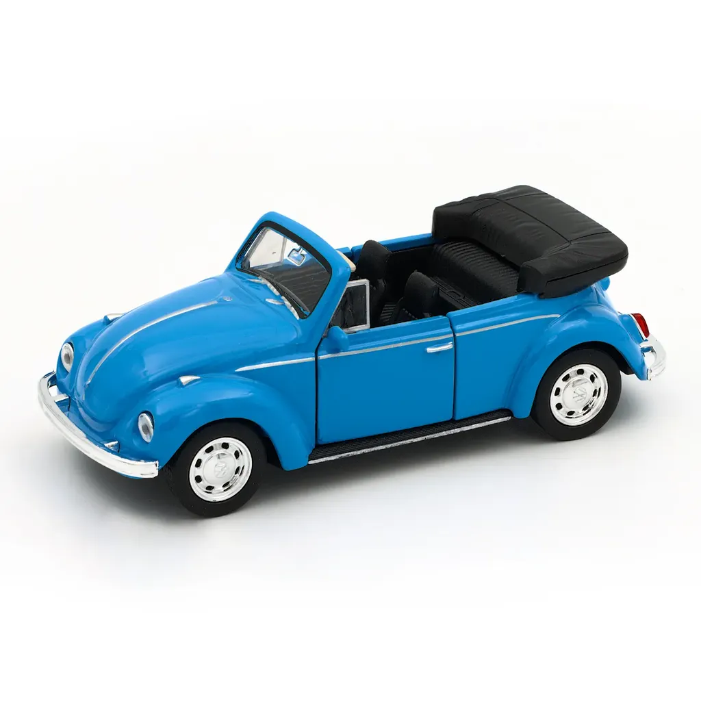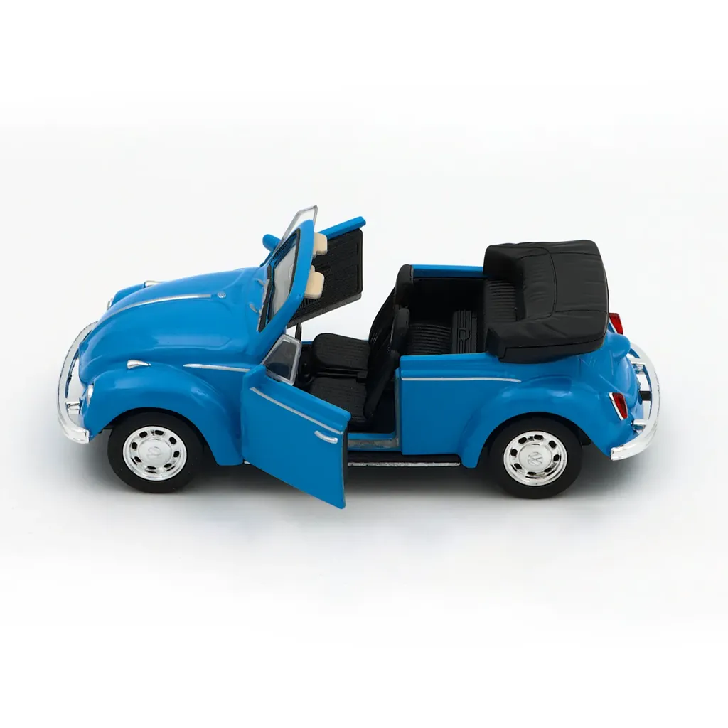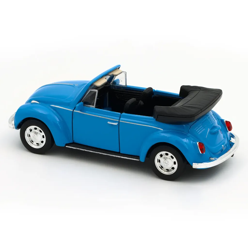 Blå Volkswagen Beetle Cabriolet fra Welly. Bilen er 11,5 cm lang (skala 1:34).