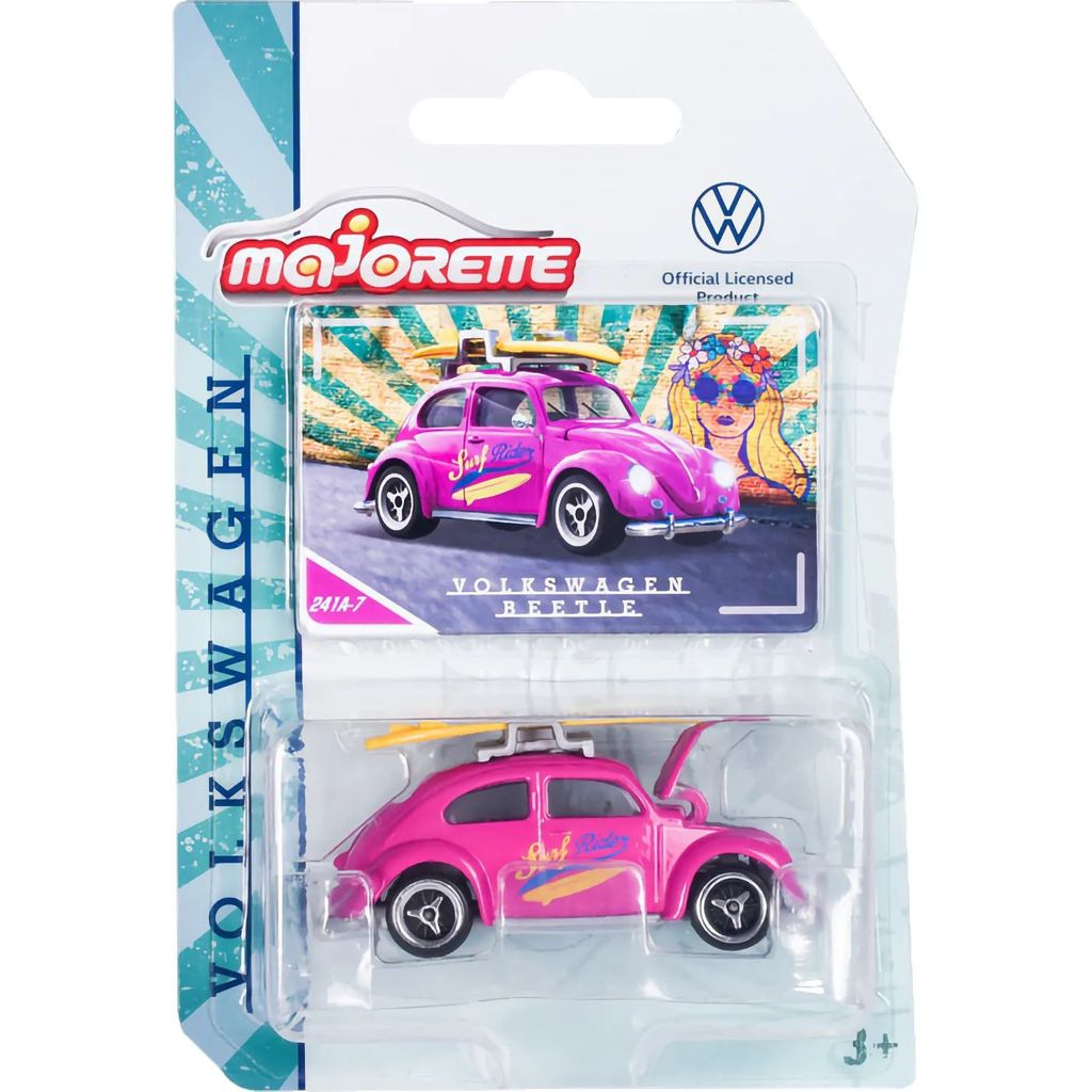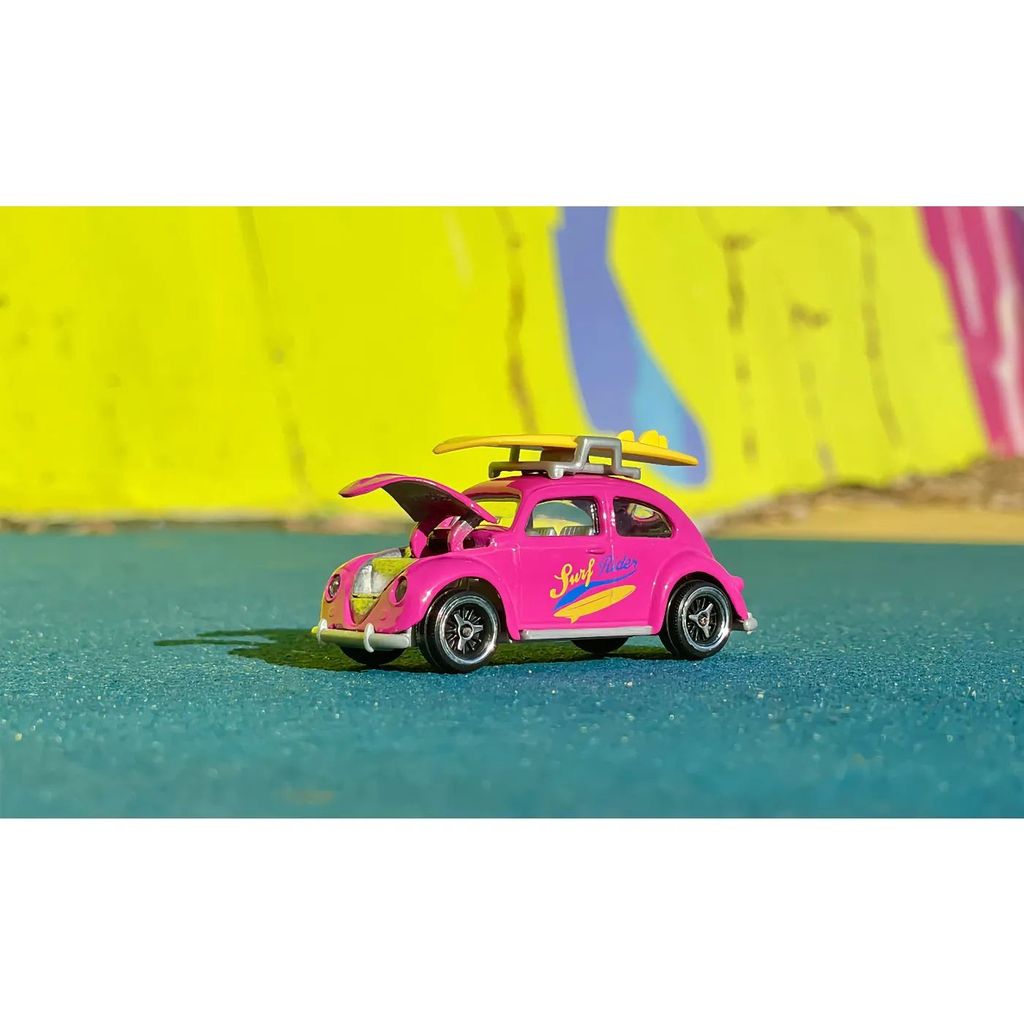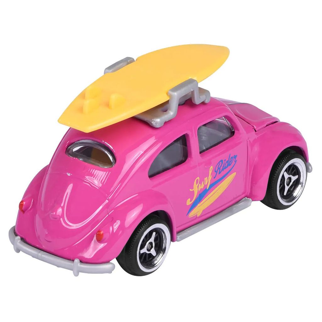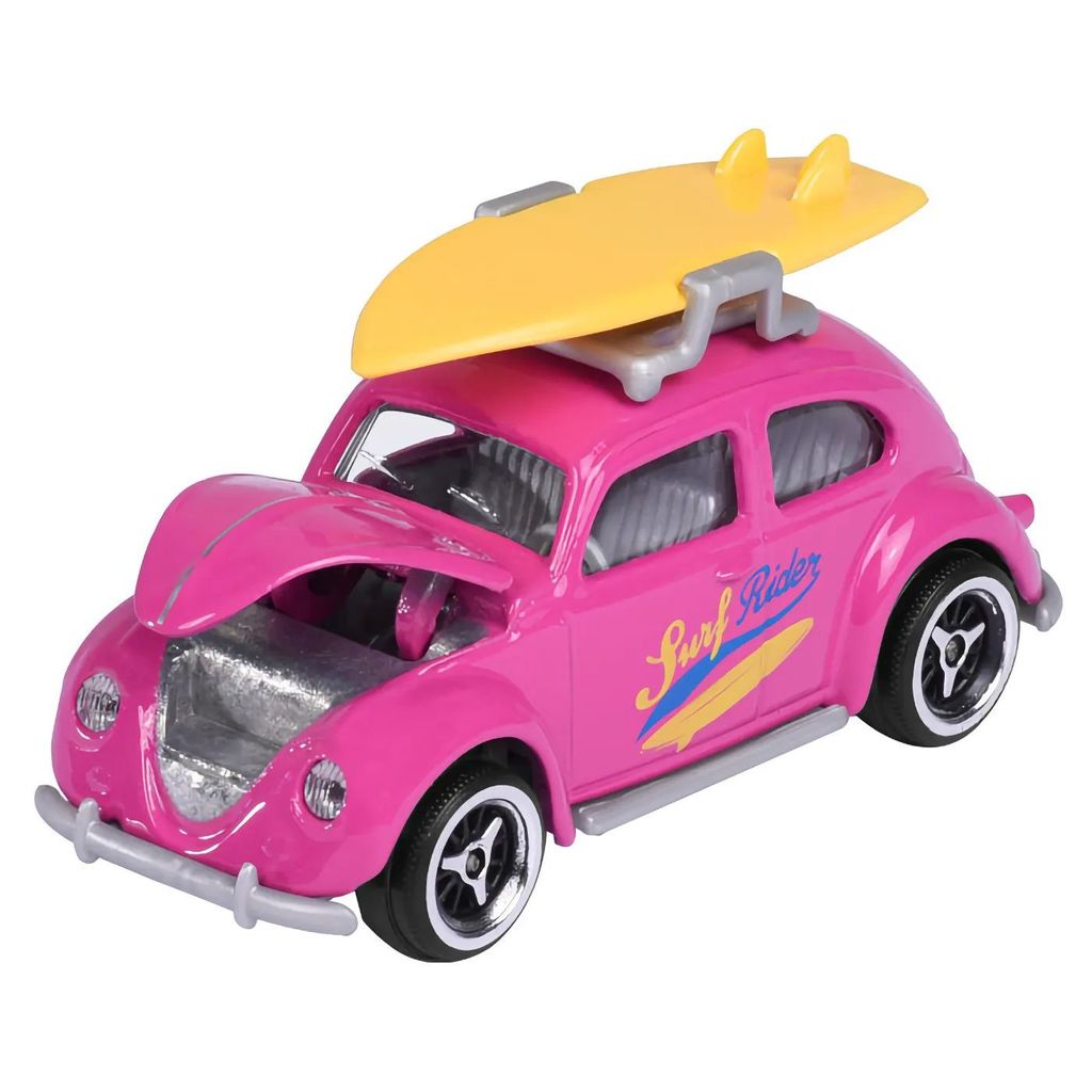 Fra Majorettes Volkswagen-serie kommer denne pink Volkswagen Beetle. Beetle ("boble") har et gult surfbræt på taget.
