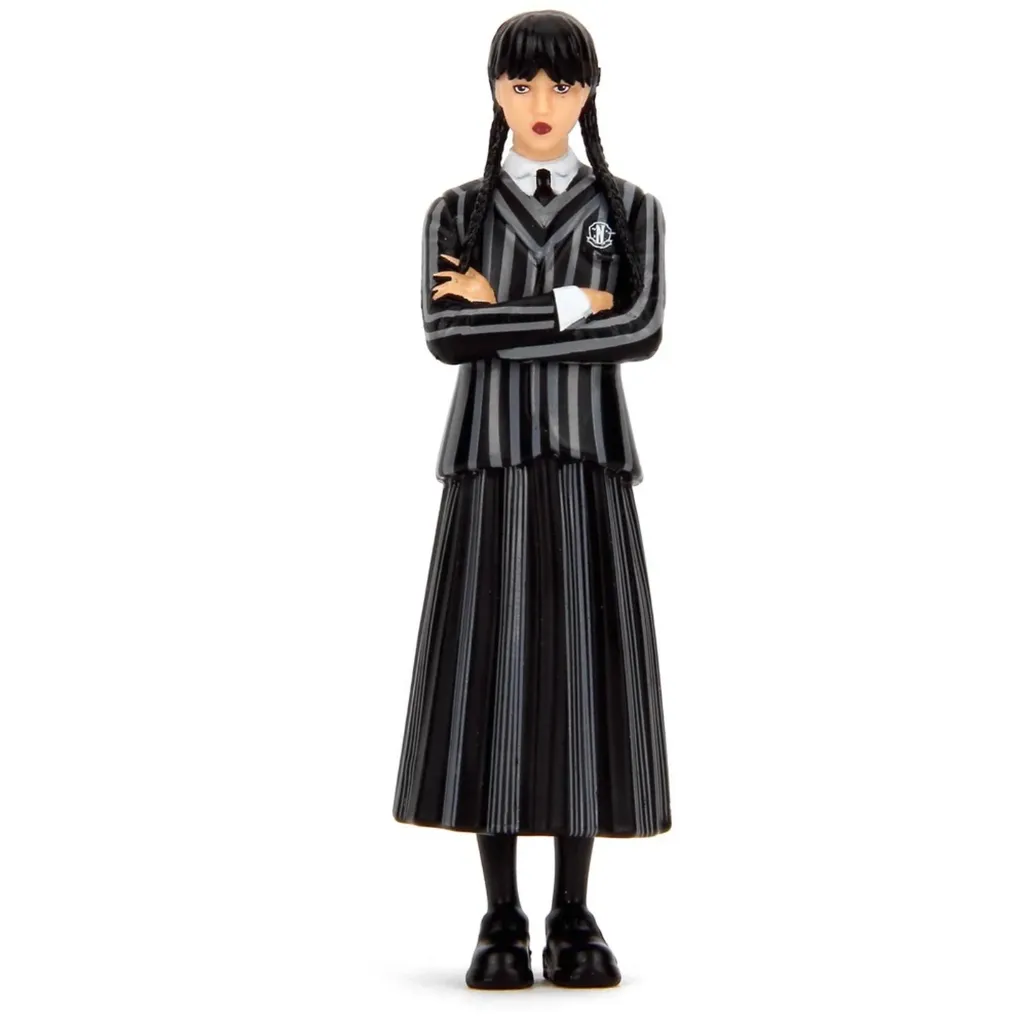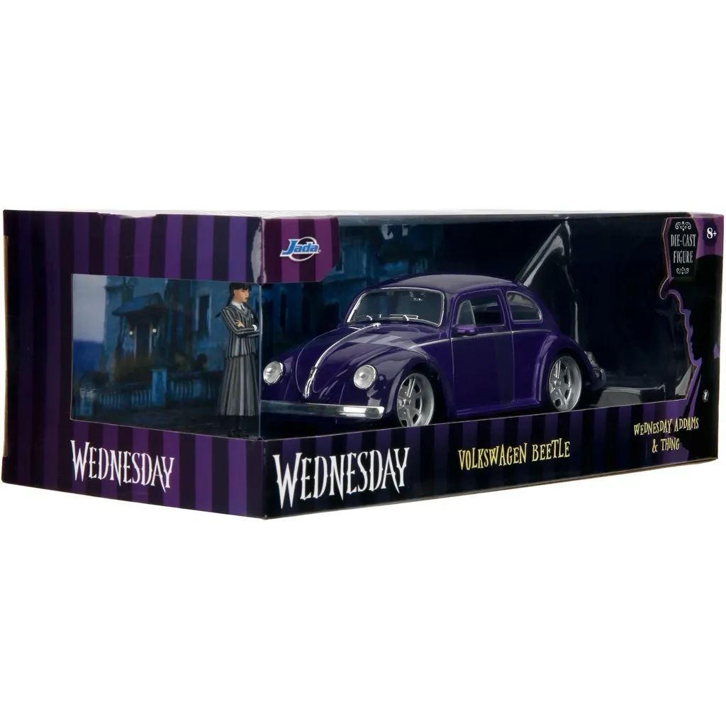 Lilla Volkswagen Beetle og figuren Wednesday fra Addams Family fra producenten Jada Toys i skala 1:24 (19 cm). The Thing (afskåret hånd) medfølger også og kan sættes fast på den bageste kofanger.