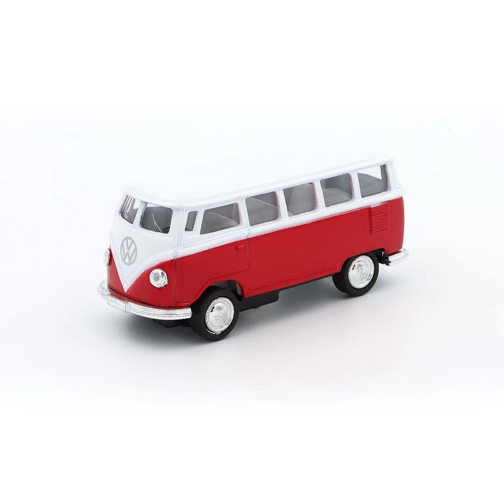 Volkswagen Classical Bus (1962) fra Kinsmart i skala 1:64 (længde 6,7 cm). Legetøjsbilen fås i flere farver.