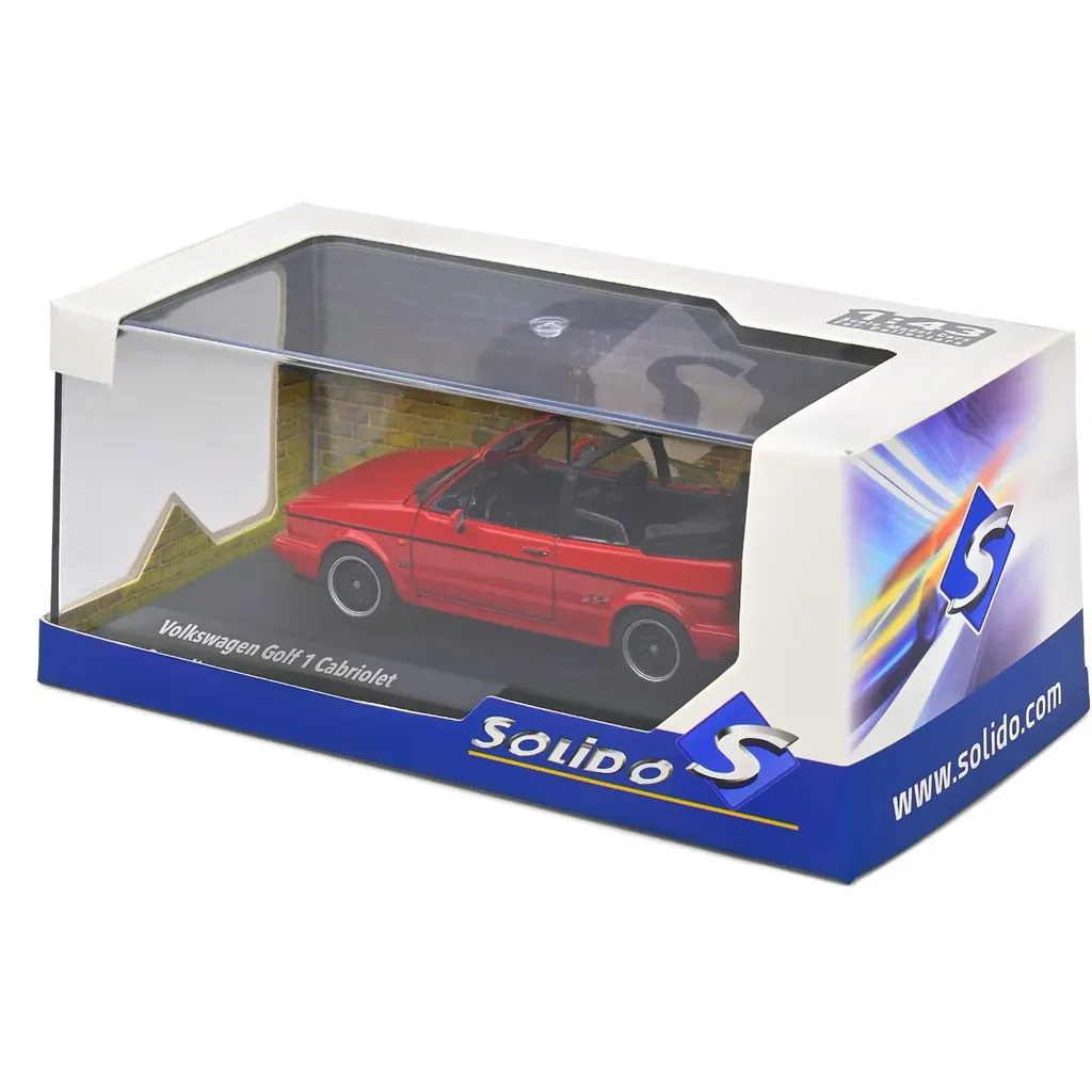 Volkswagen Golf MK1 Convertible (cabriolet) Sportline, modelår 1992, som modelbil fra franske Solido. Modellen er lavet i skala 1:43, hvilket for denne model er 9 cm "VW-cab". Farven er rød (Tornado Red).