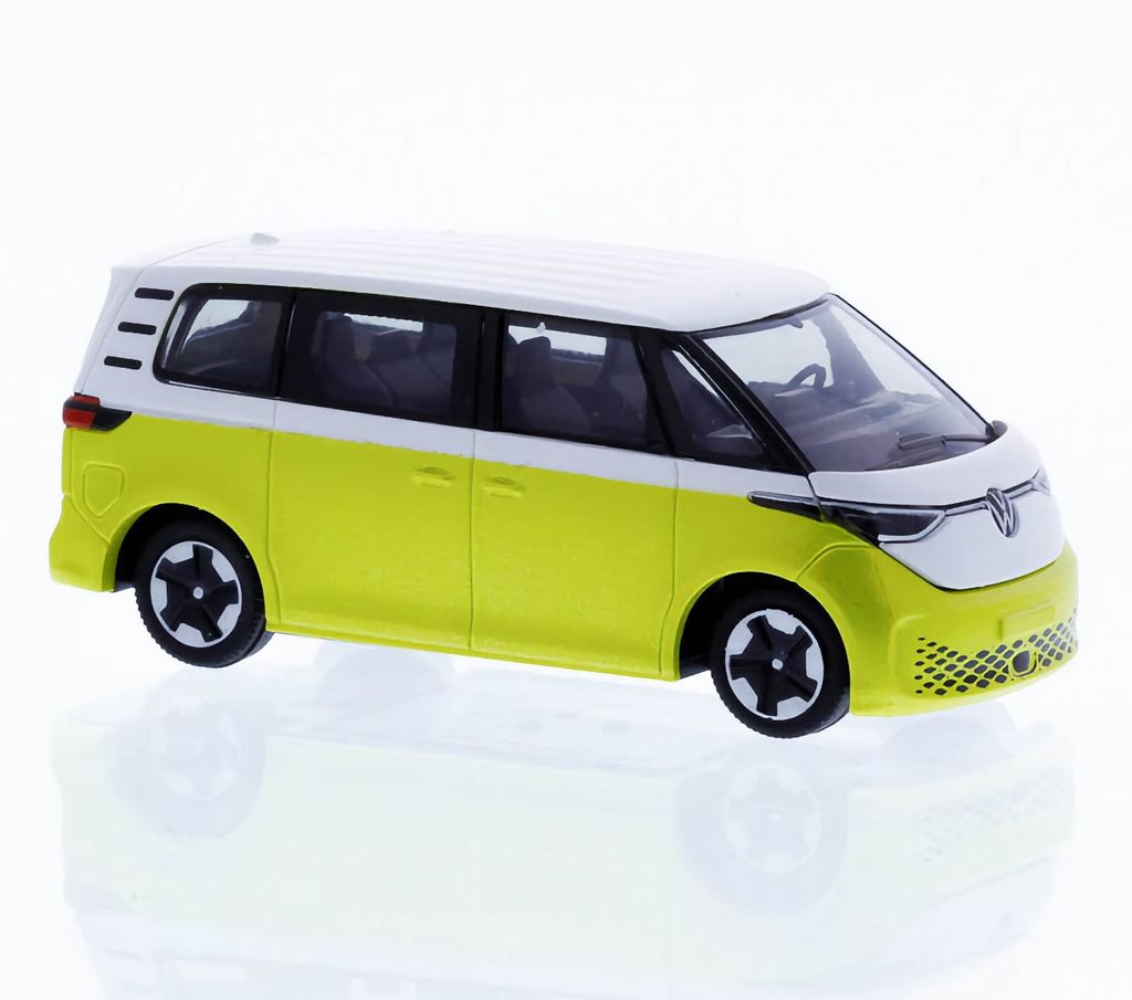 Model af en hvid/gul (Candy White/Lime Yellow) Volkswagen ID. Buzz i skala 1:87 (5,4 cm).