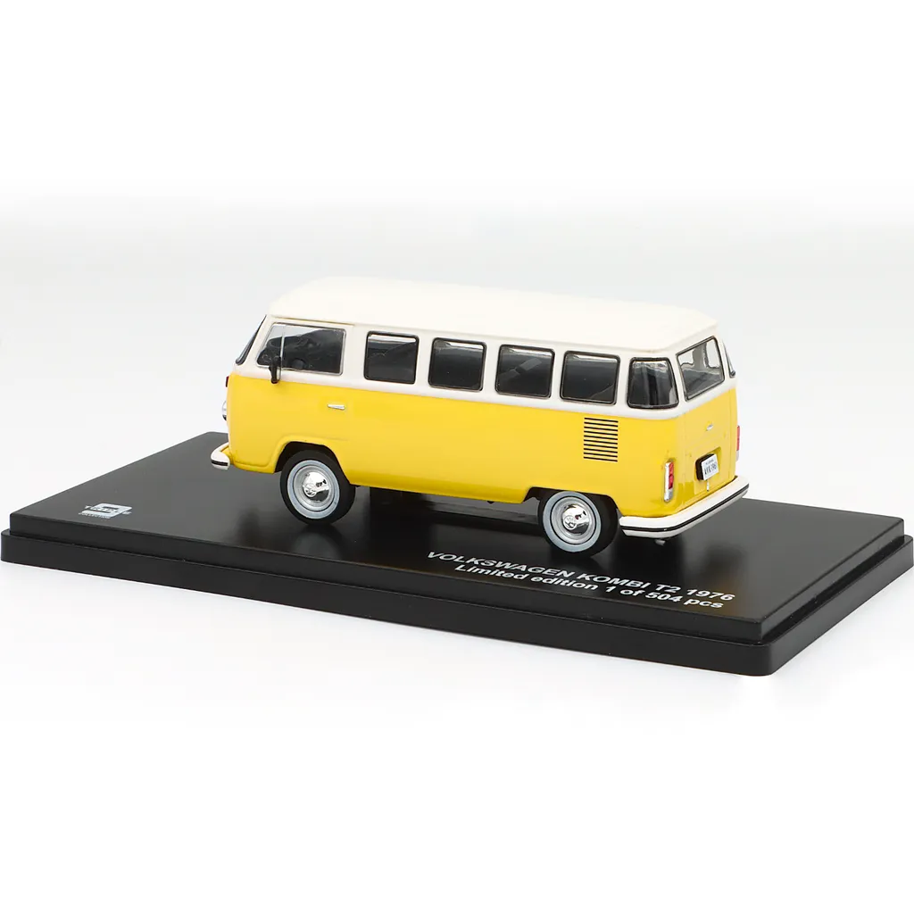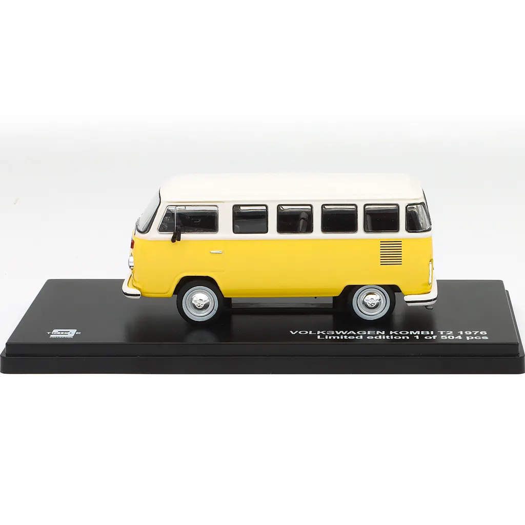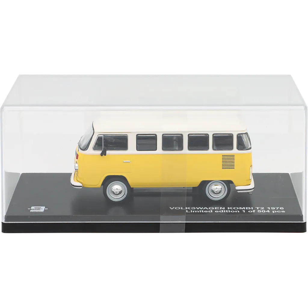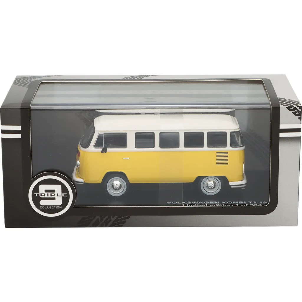 Volkswagen Kombi T2, modelår 1976, i gul med hvidt tag fra modelbilproducenten Triple9 Collection. Skalaen er 1:43, hvilket er 10,5 cm folkabuss i modelformat.