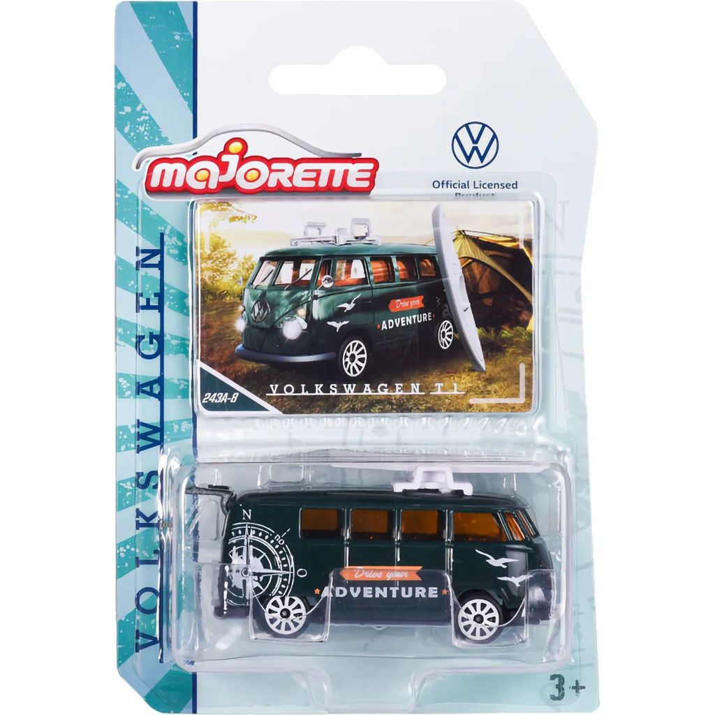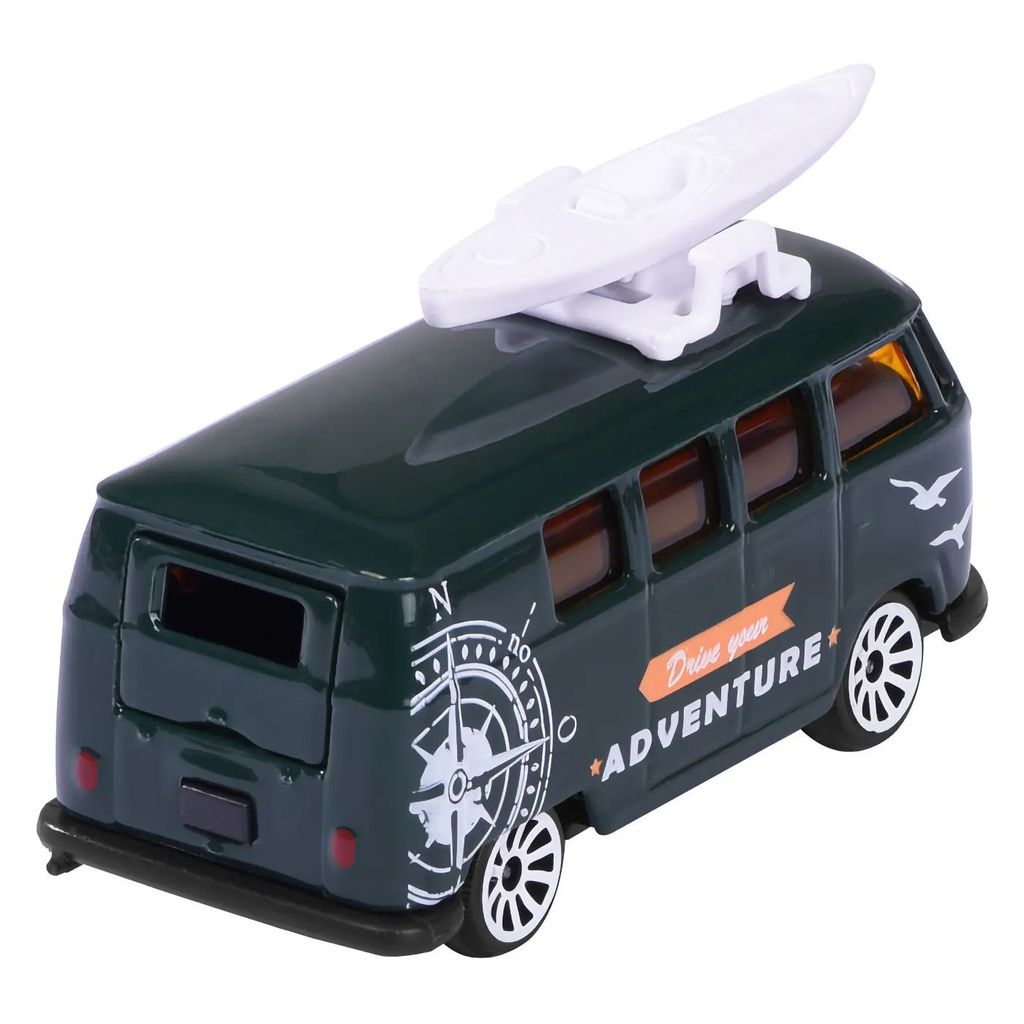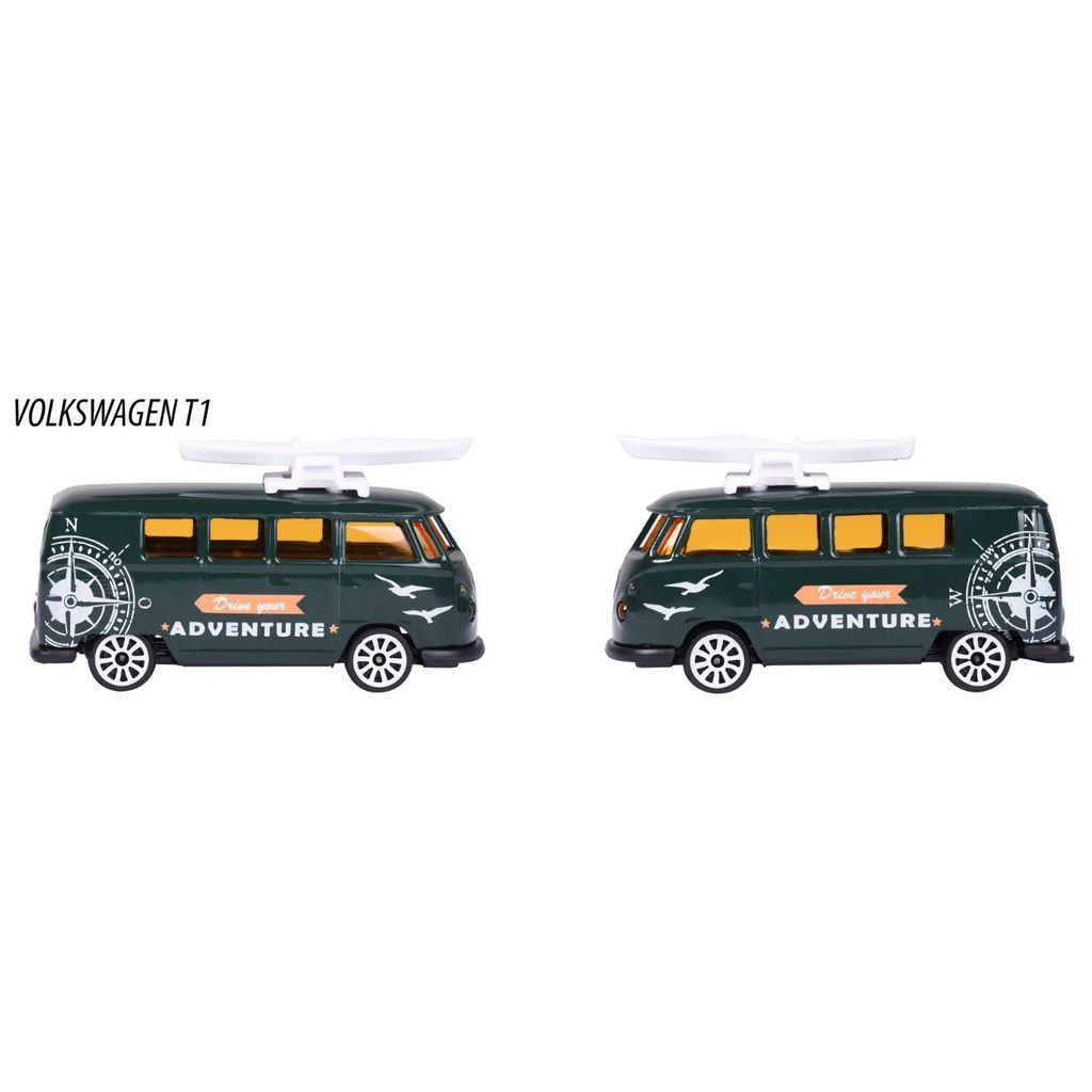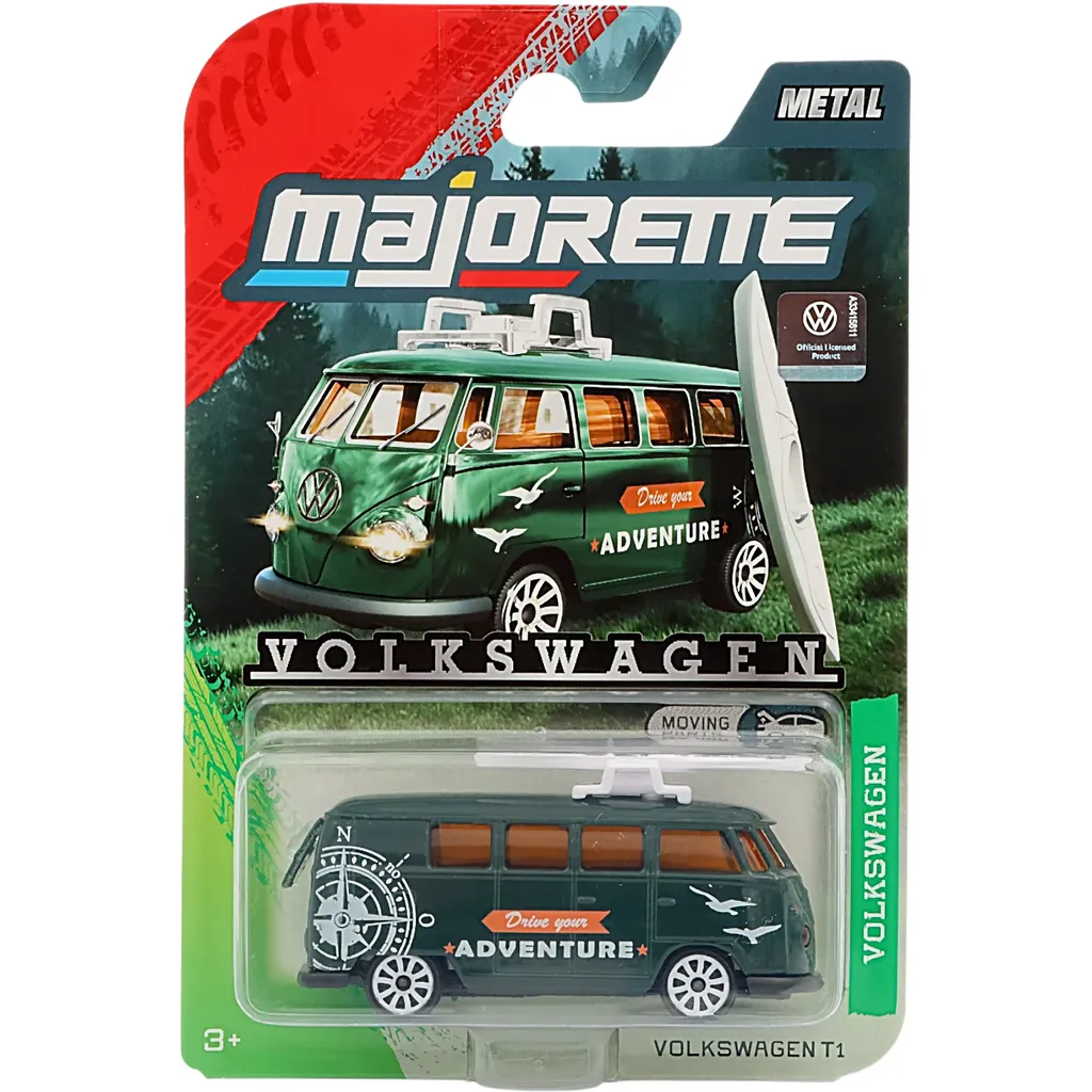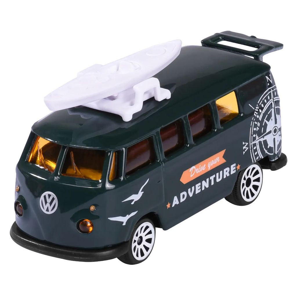 Fra Majorettes Volkswagen-serie kommer denne mørkegrønne Volkswagen T1. Bussen har eventyrmotiver i form af et kompas og fugle. Bussen har et surfbræt på taget.