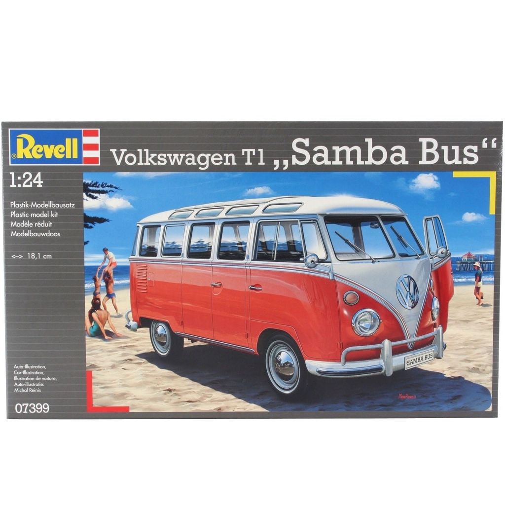 Byggemodel i plast fra Revell, der udfordrer dig til at bygge en Volkswagen T1 "Samba Bus" i skala 1:24 (18,1 cm).
