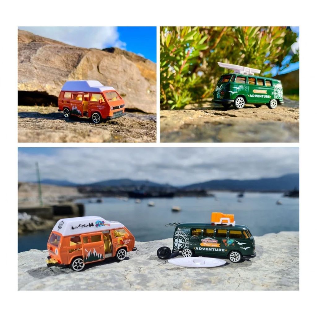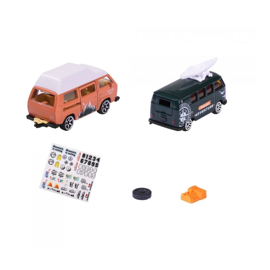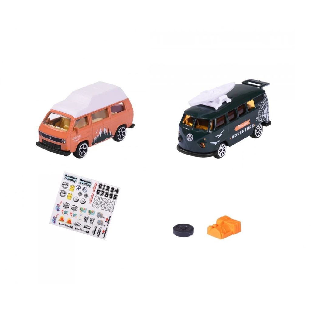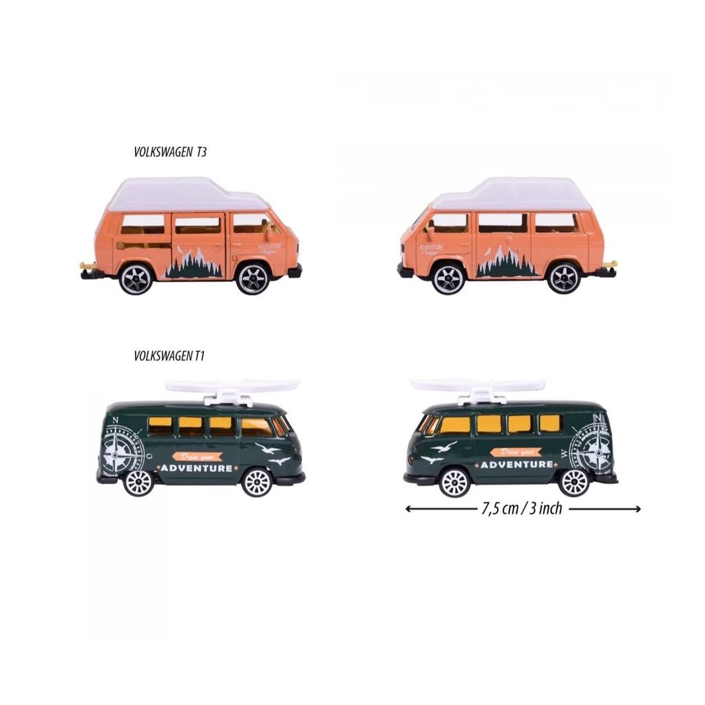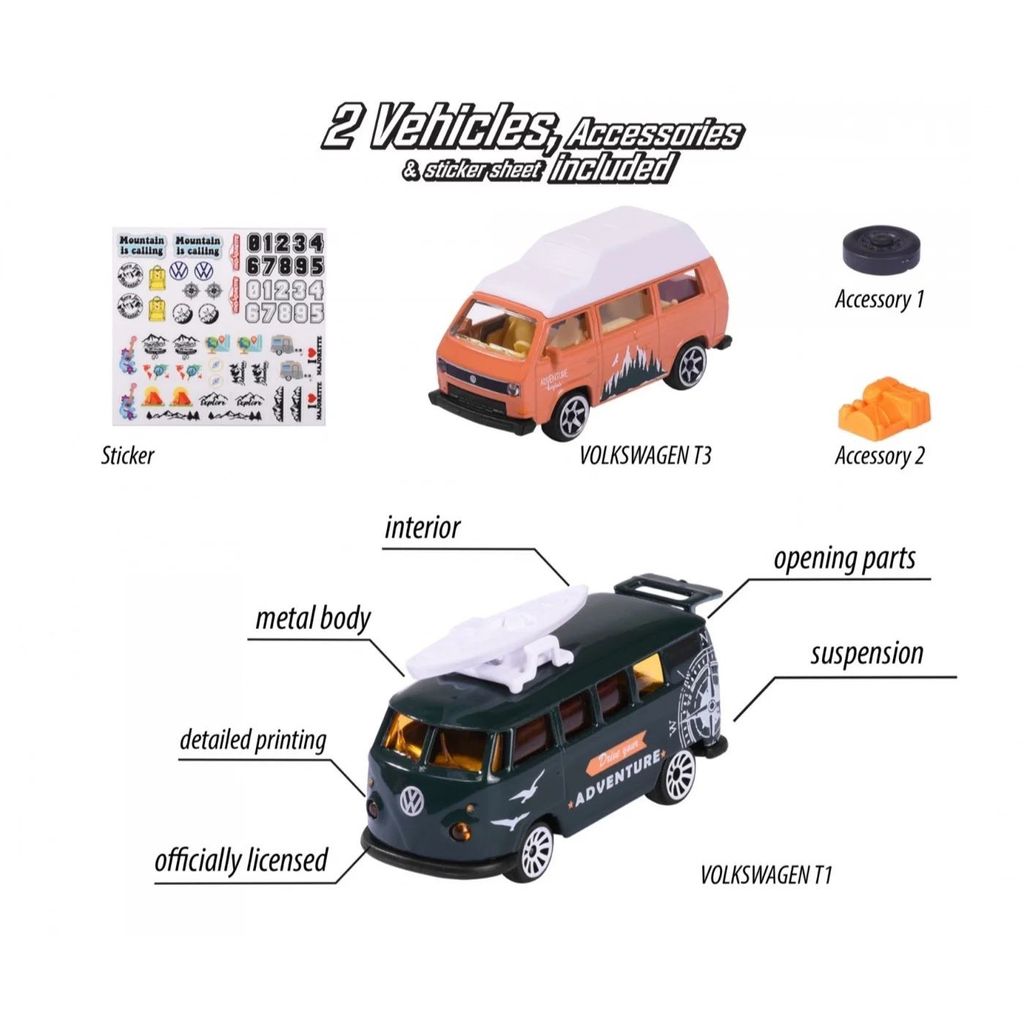 Fra Majorettes Volkswagen The Originals-serie sælger vi denne 2-pak med legetøjsbiler. Pakken indeholder en orange Volkswagen T3 og en grøn Volkswagen T1, begge med et eventyrtema. Der medfølger også tilbehør som en tagpakning, et reservehjul og klistermærker.