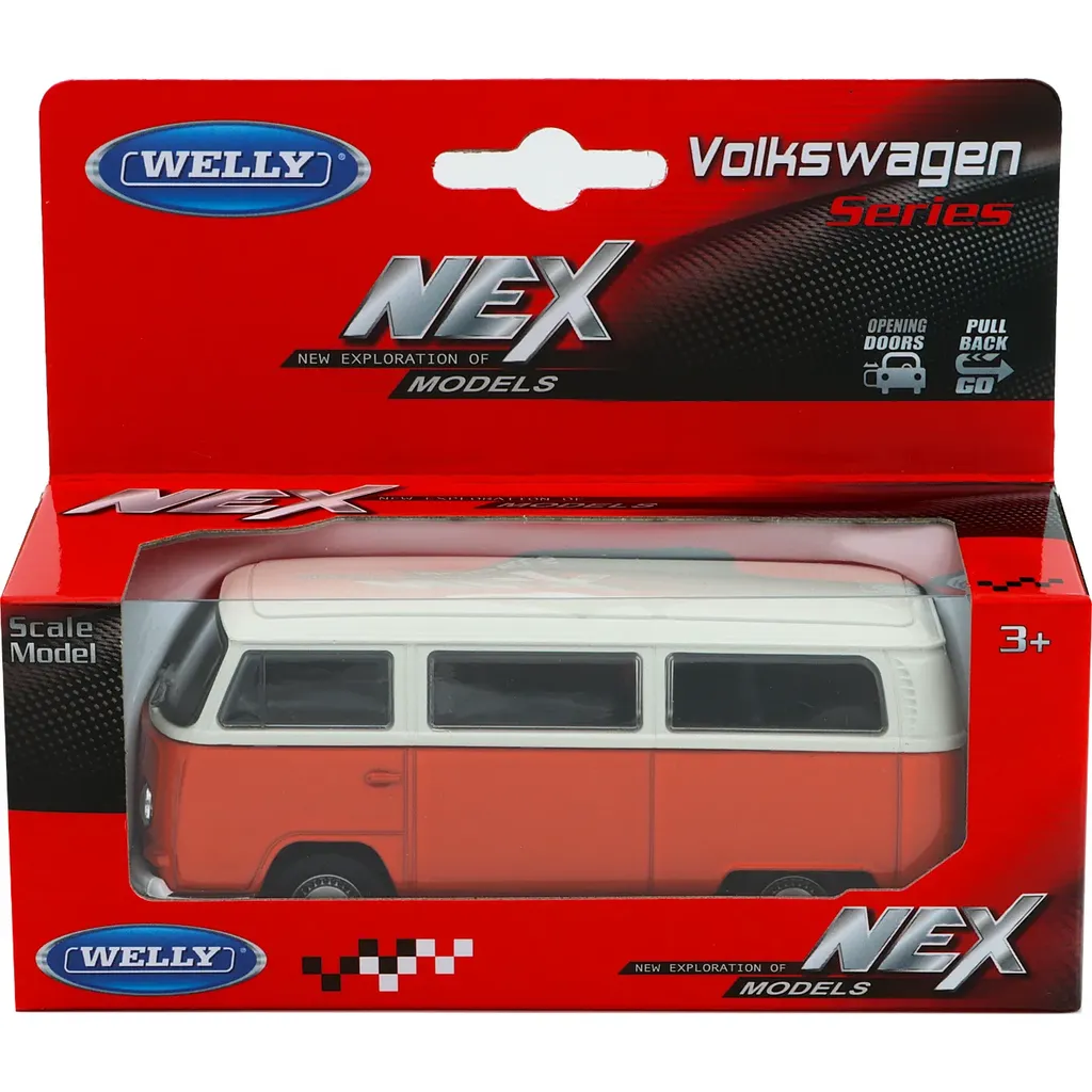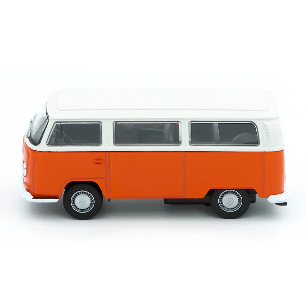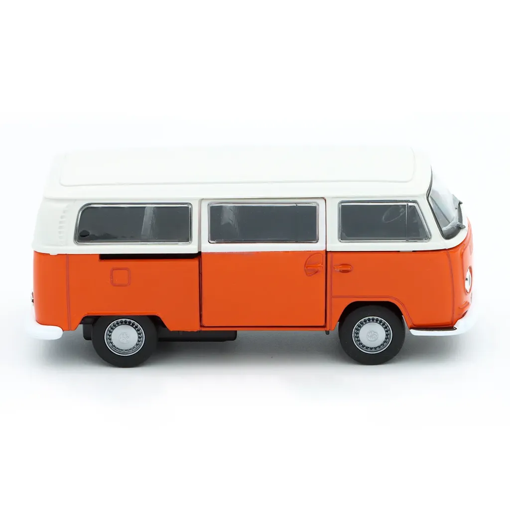 Folkabus T2 fra 1972 som legetøjsbil fra Welly. Bussen er 11 cm lang (skala 1:34). Bussen er orange med hvid/beige top.