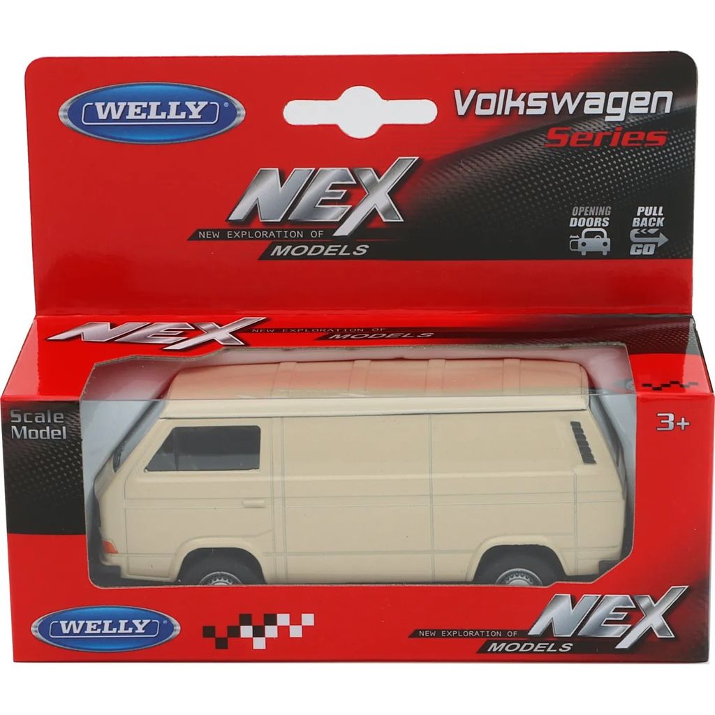Beige Volkswagen T3 VAN fra Welly. Varevognen er 11 cm (målestok ca. 1:34-1:39).