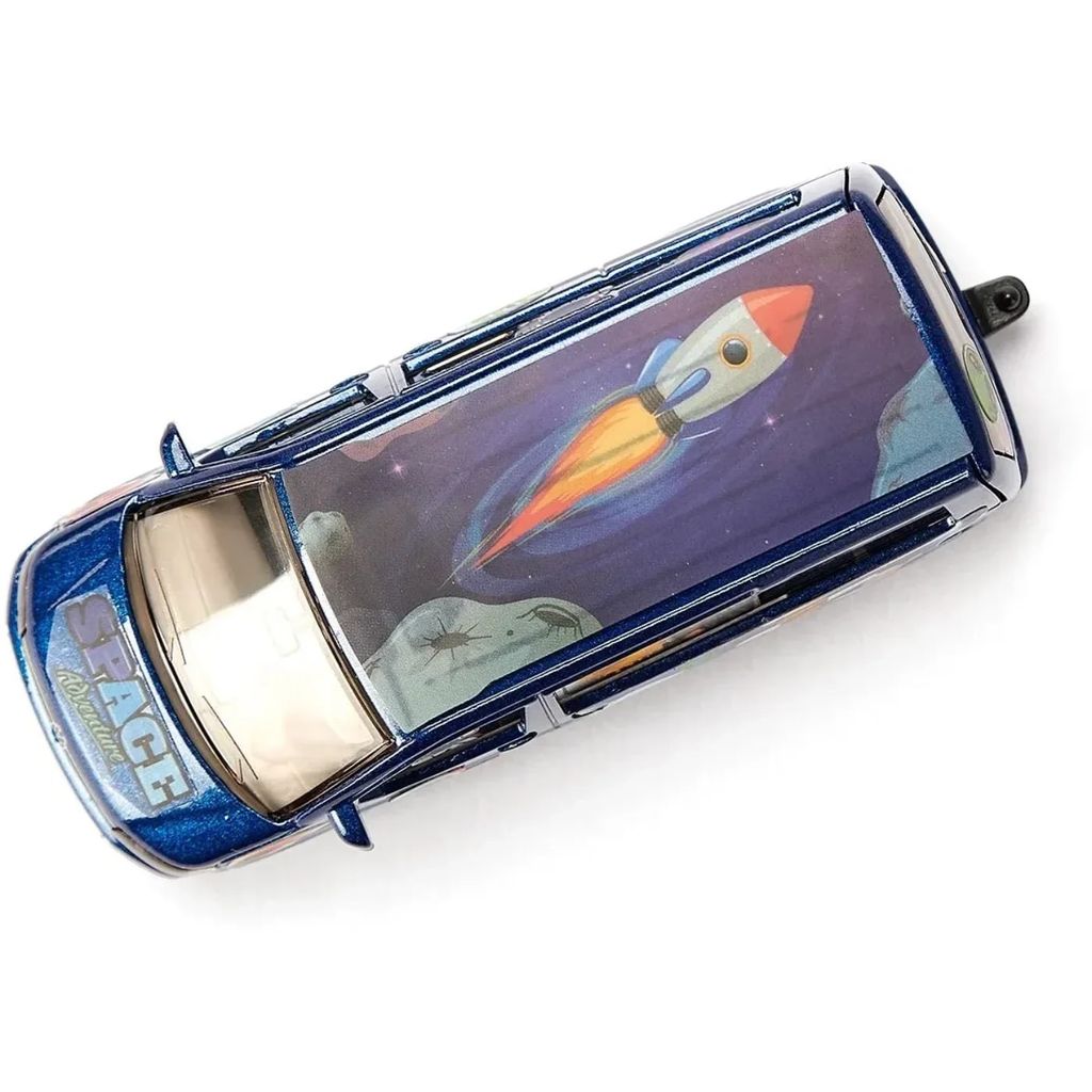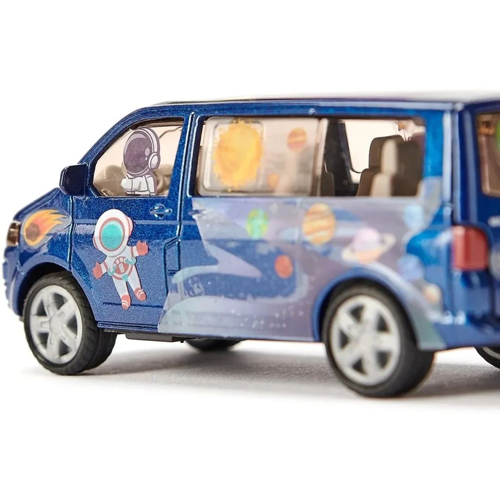 Byg en blå Volkswagen T5 med dette sæt fra Siku. Klistermærker med rumtema medfølger.