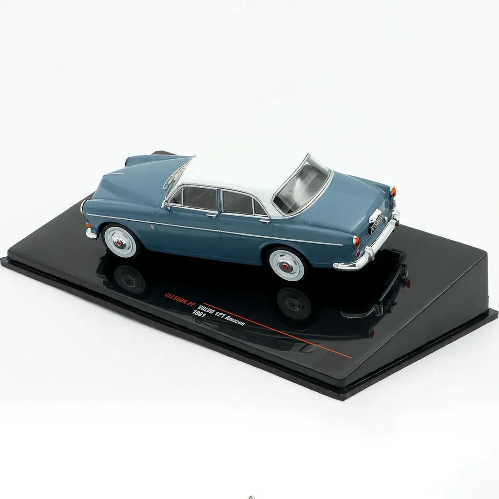 Amazonen leveres i en plastkasse, der dækker bilen, som er monteret på en sort bundplade med teksten "VOLVO 121 Amazon 1961" i sølv.