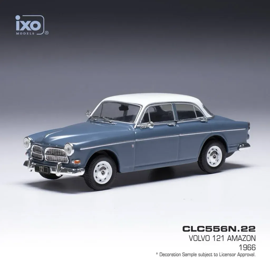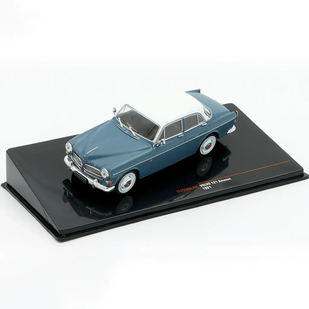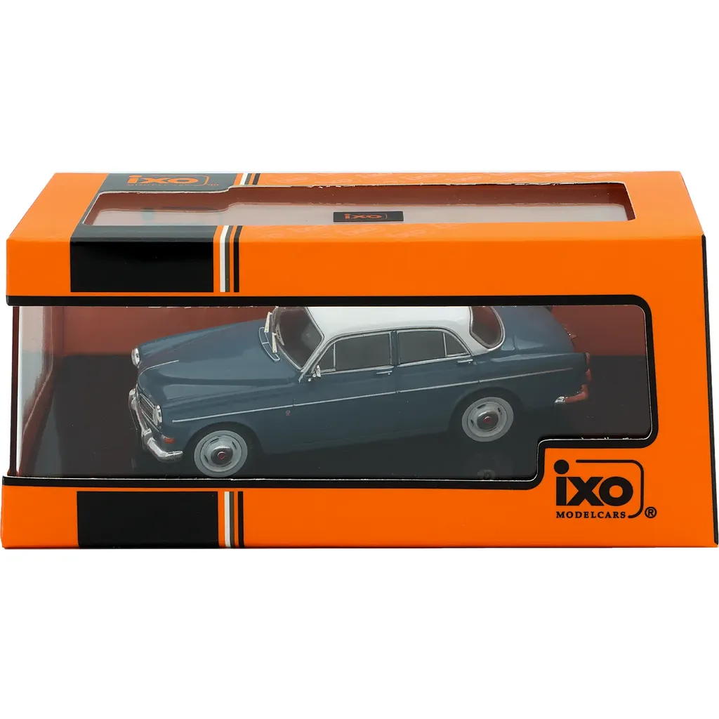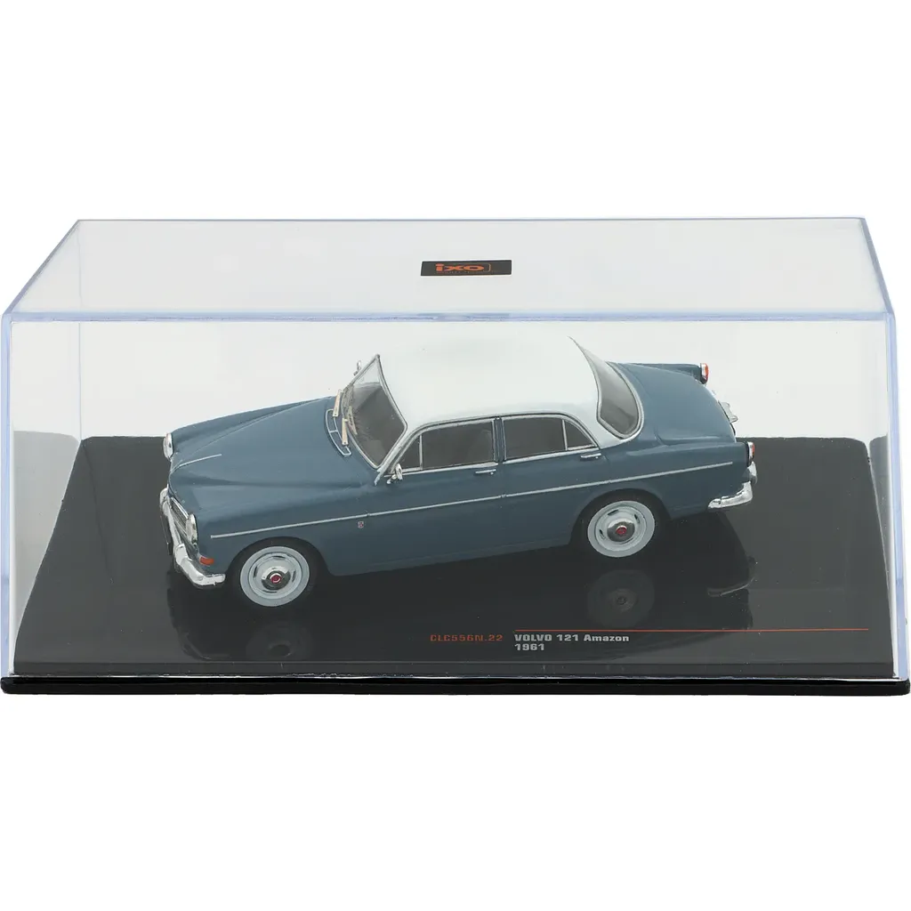 Volvo 121 Amazon (modelår 1961) i grå (blå) med hvidt tag som modelbil fra Ixo Models. Modellen er i skala 1:43 (10 cm).