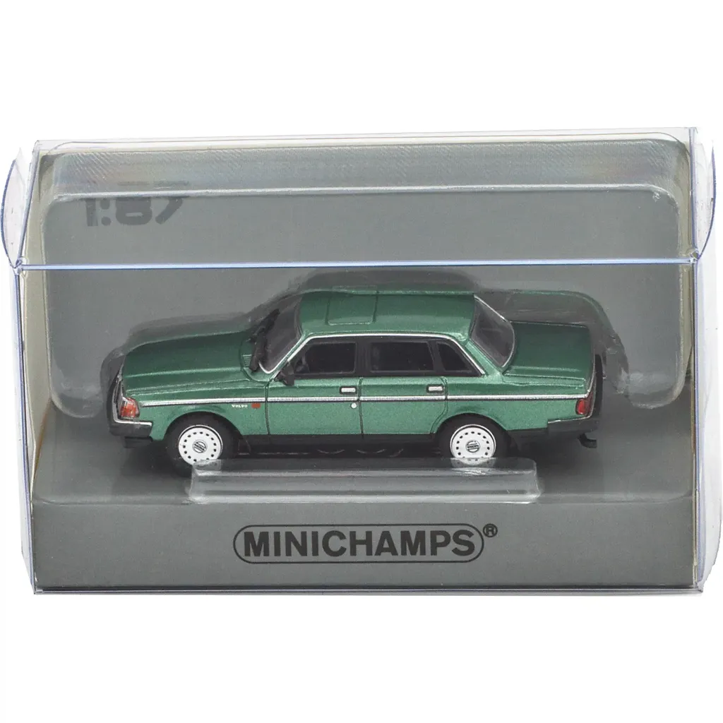 Grønmetallic Volvo 240 GL, modelår 1986, som lille modelbil i skala 1:87 (5,4 cm). Modellen er fremstillet af tyske Minichamps.