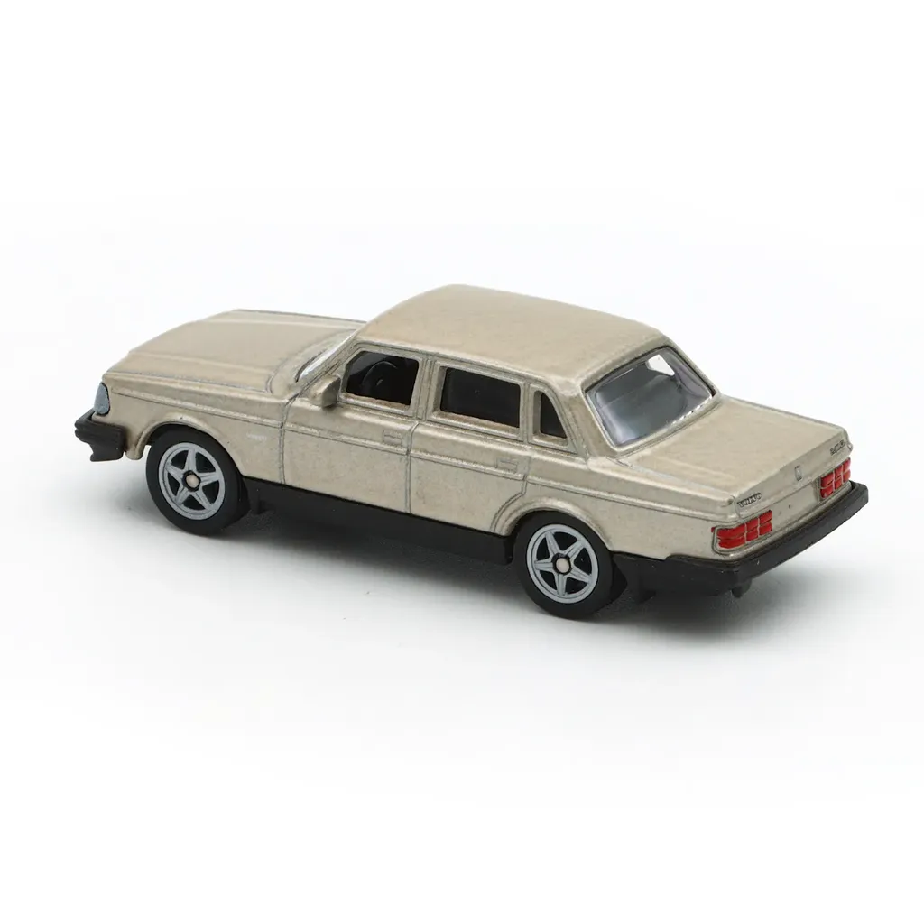 Guldfarvet Volvo 240 GL fra Welly i skala 1:64 (7,5 cm). Volvoen er et givet element i legeværelset såvel som på hylden eller i samlingen hos alle Volvo-entusiaster.