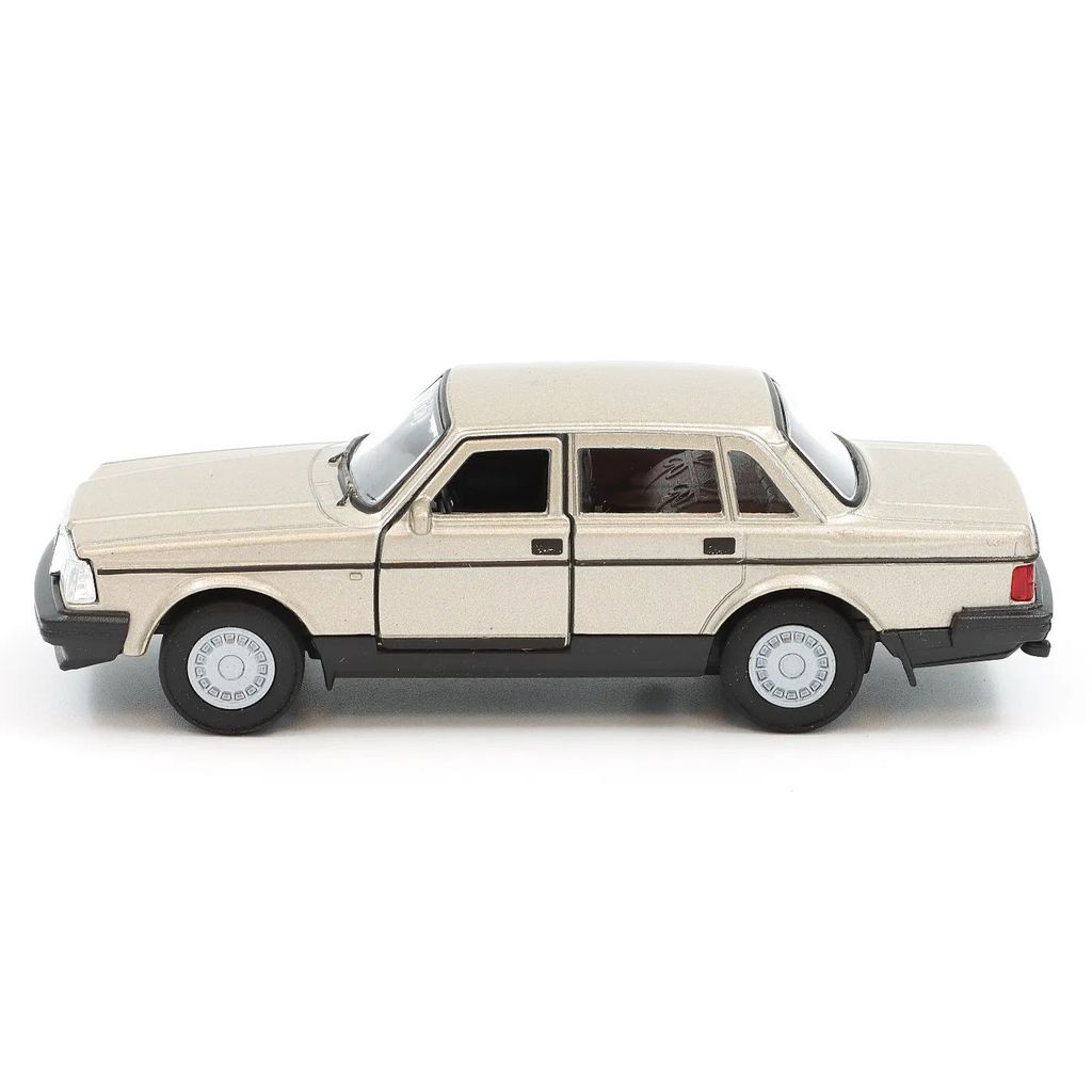 Guldfarvet/metallic beige Volvo 240 GL fra Welly i skala 1:37 (12 cm). Volvoen har døre, der kan åbnes, og pullback, så den er et givet indslag i legeværelset såvel som på hylden eller i samlingen hos alle Volvo-entusiaster.