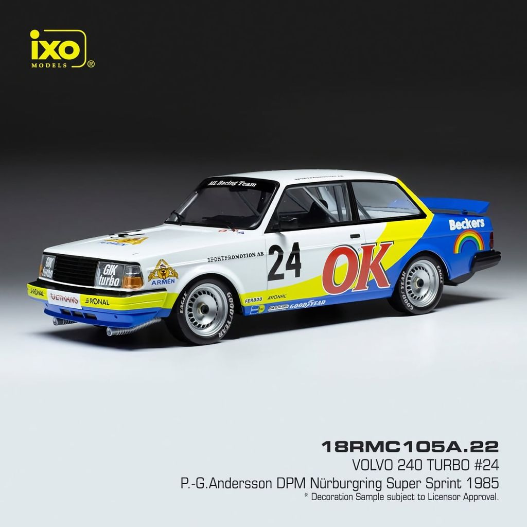 Volvo 240 Turbo med nummer 24 kørt af Per-Gunnar "Peggen" Andersson under DPM Nürburgring Super Sprint 1985. Målestokken er 1:18 (27 cm), og producenten er Ixo Models.