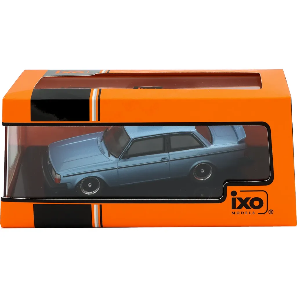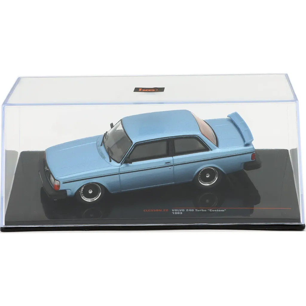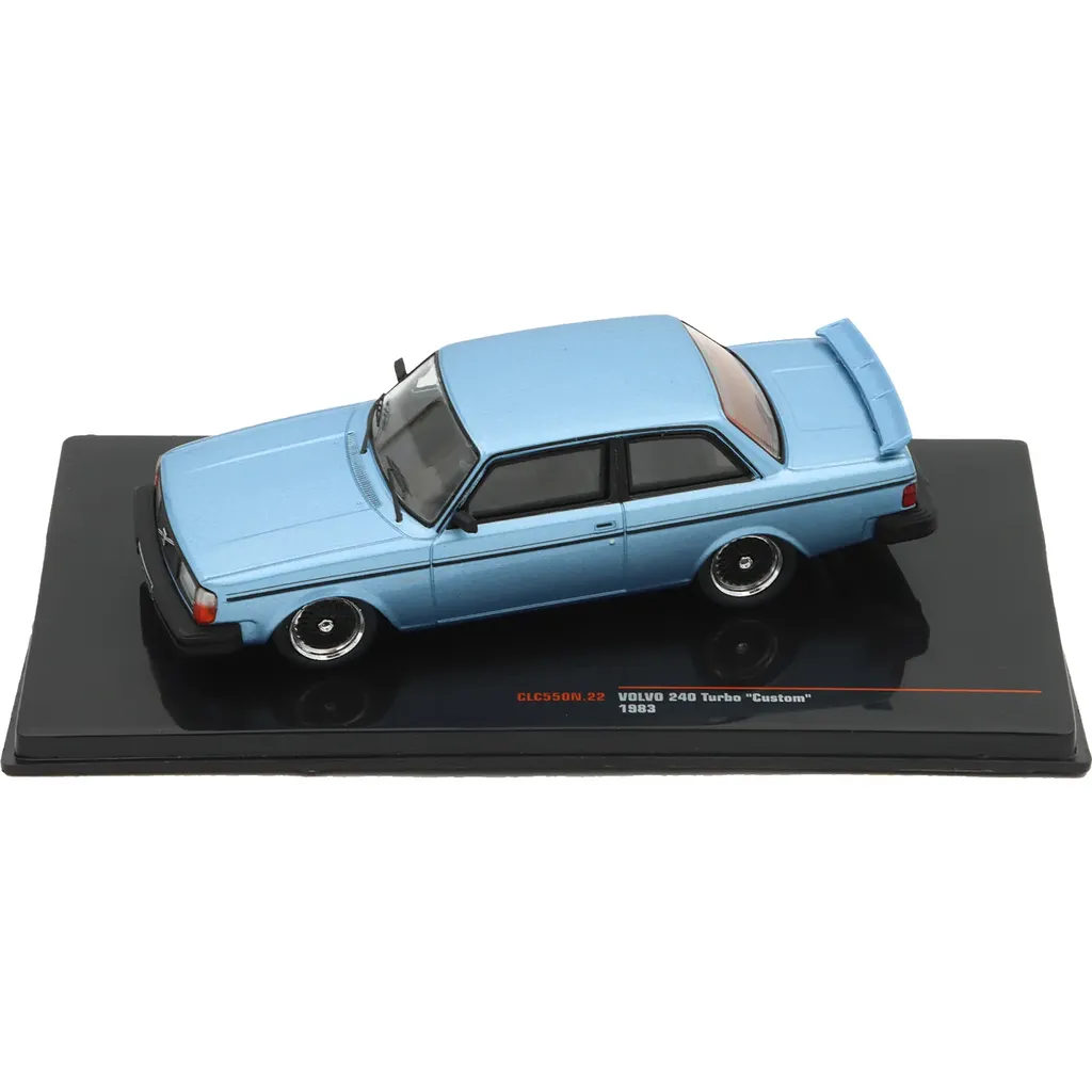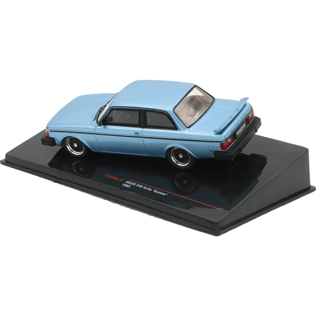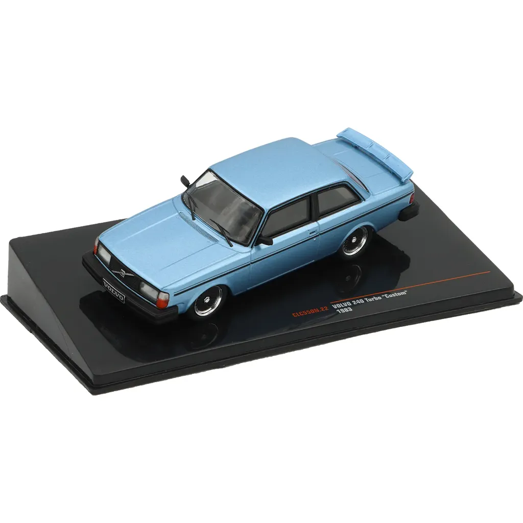 Volvo 240 Turbo "Custom" modelår 1983 som modelbil fra Ixo Models i skala 1:43 (11 cm). Bilen er lyseblå i en metallisk maling.