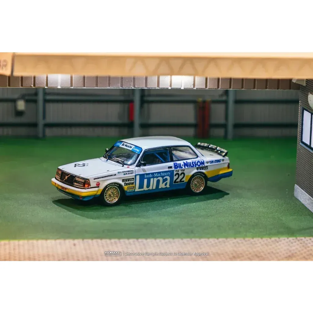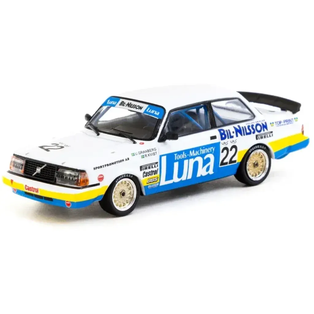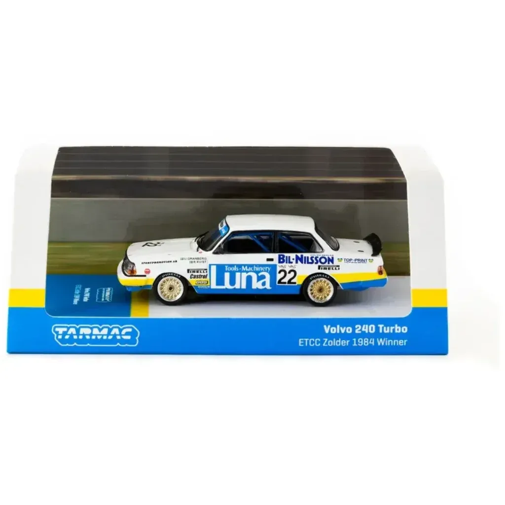 Volvo 240 Turbo, der vandt ETCC Zolder 1984, fra modelbilproducenten Tarmac Works og HOBBY64-serien i skala 1:64 (7,6 cm).