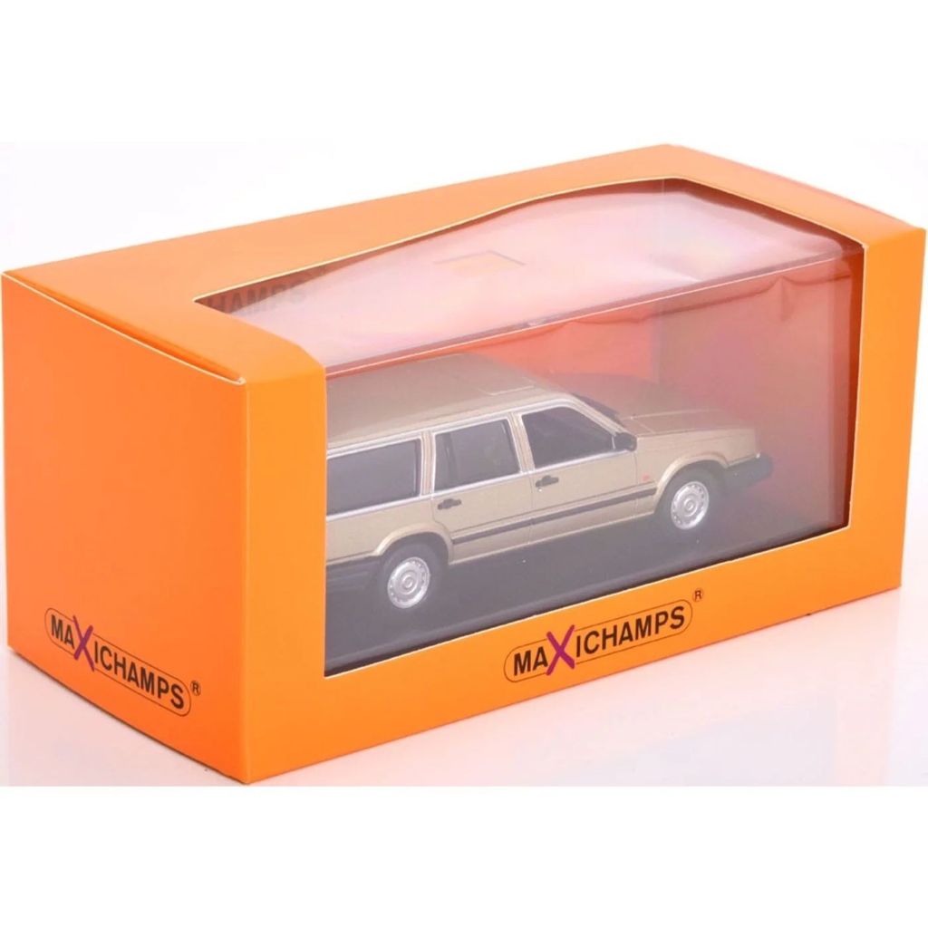 Model, skala 1:43, af en guldfarvet Volvo 740 GL modelår 1986. Modelbilen er produceret af Minichamps og er en del af Maxichamps-serien.