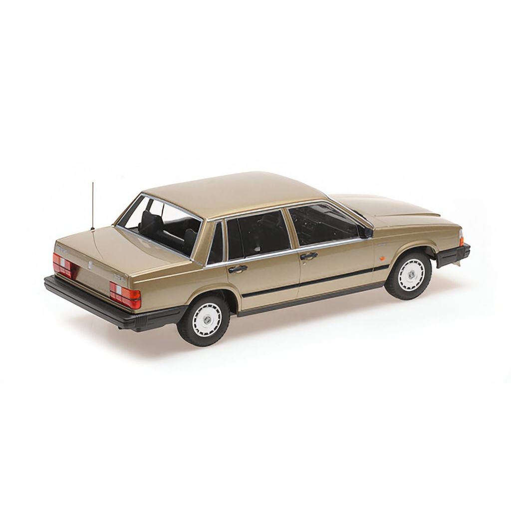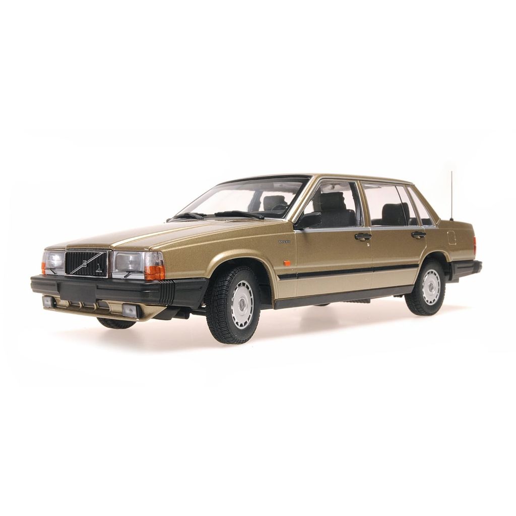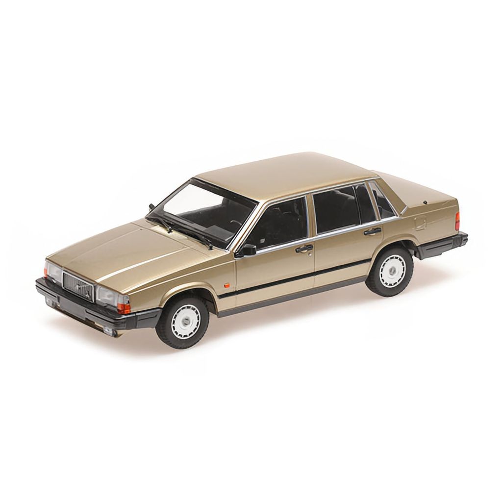 Volvo 740 GL i guld som modelbil fra tyske Minichamps. Dette er en ægte svensk klassiker afbildet af Minichamps i skala 1:18 (26 cm).