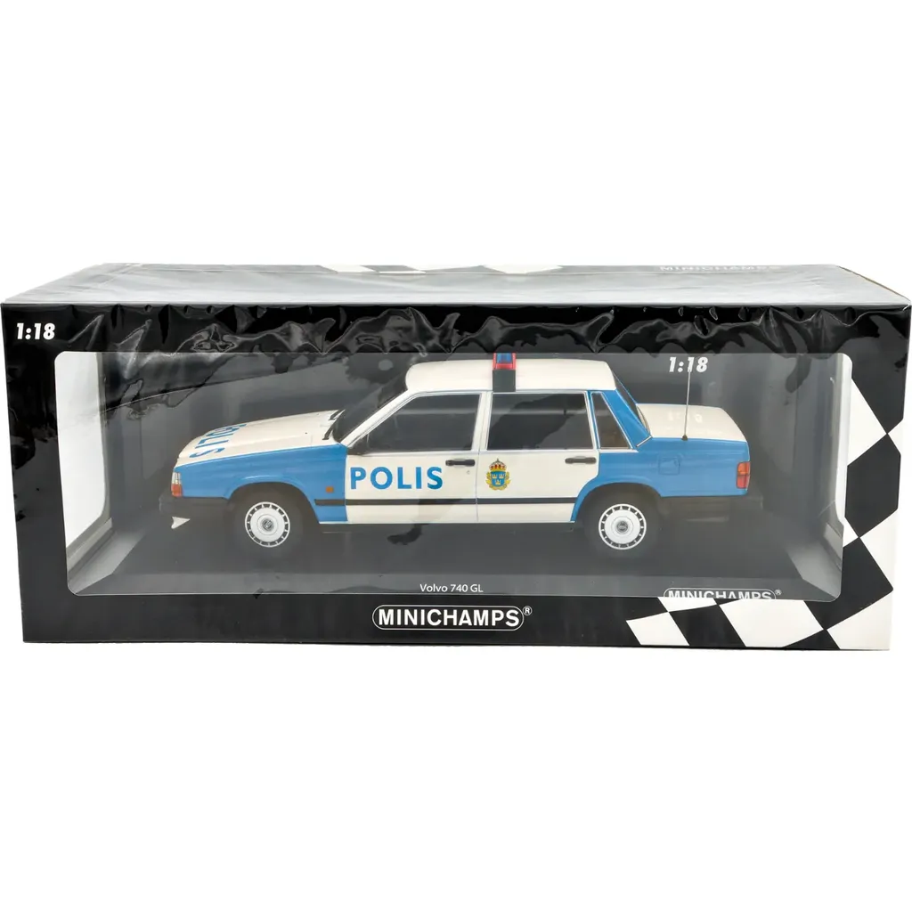 Volvo 740 GL, modelår 1986, som svensk politibil fra Minichamps i skala 1:18 (26 cm).