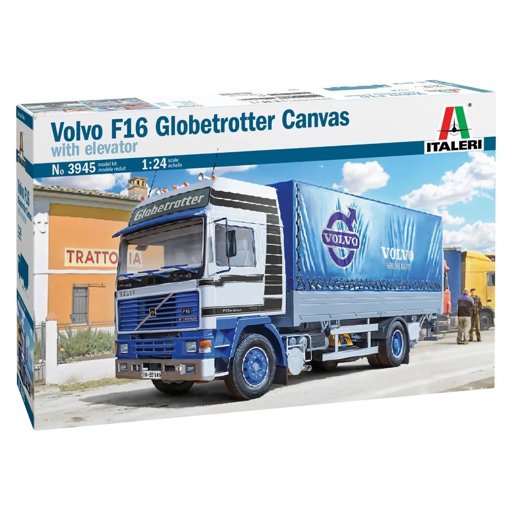 Fra italienske Italeri tilbyder vi dette sæt (nummer 3945), som, når det samles, bliver til en Volvo F16 Globetrotter Canvas med elevator (haleror). Skalaen er 1:24, hvilket giver os 37,5 cm Volvo F16 Globetrotter.