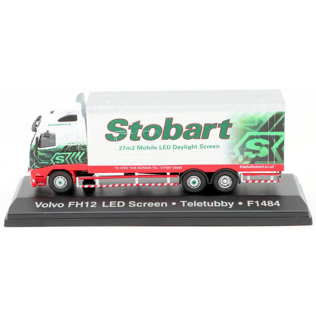 Lastbilen leveres i en papkasse stående og monteret på en sort plade med teksten "Volvo FH12 LED Screen - Teletubby - F1484".