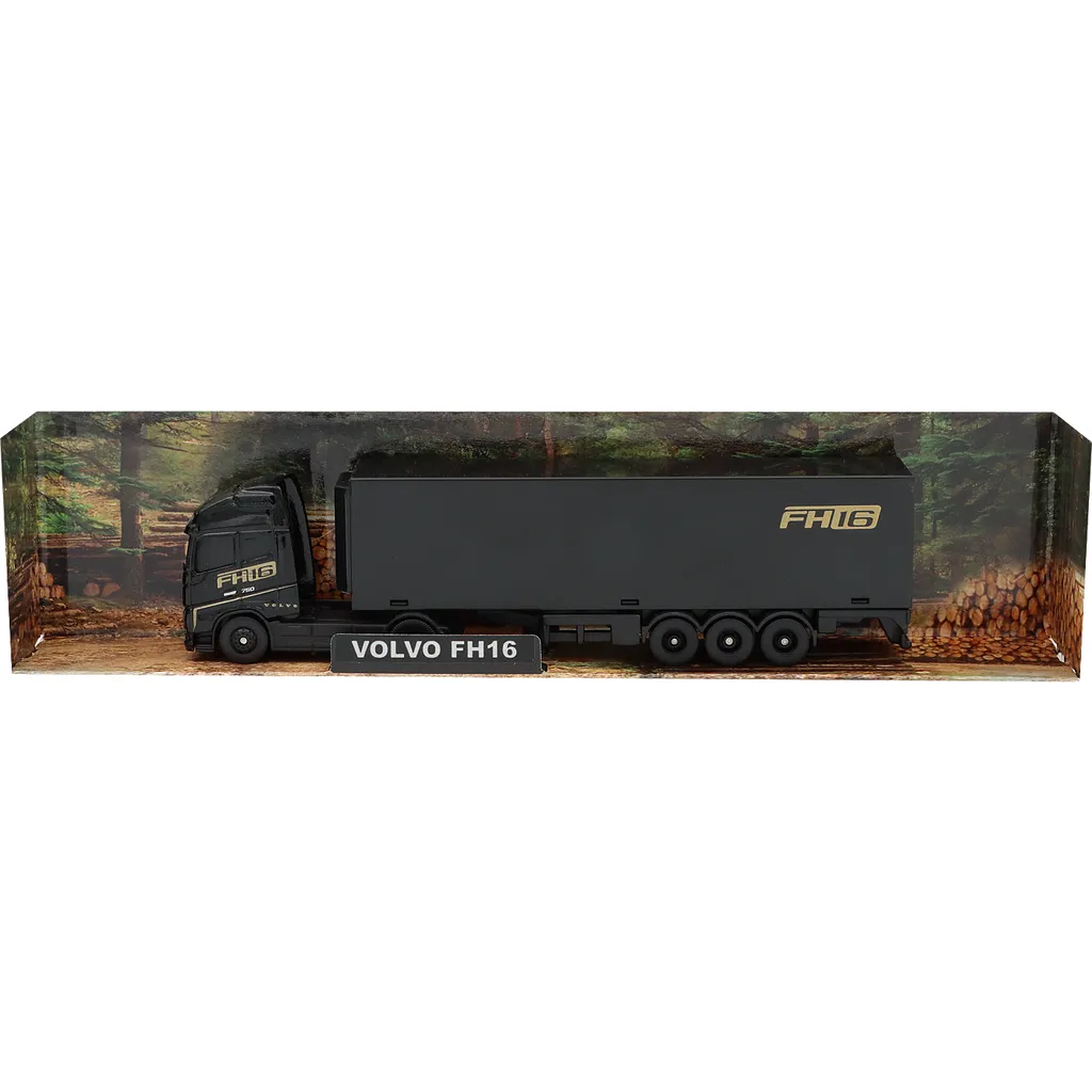 Volvo FH16-trækkeren med sort førerhus trækker en sort anhænger. Køretøjet er 18 cm langt og fremstillet af Maisto.
