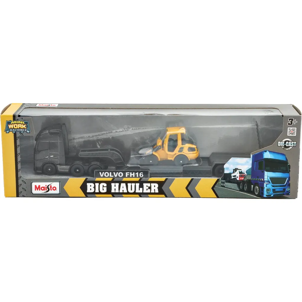Volvo FH16-trækkeren i mørkegrå (metallic, næsten sort) med anhænger transporterer en kompakt læssemaskine, også fra Volvo. Legetøjet er 22 cm langt og fremstillet af Maisto.