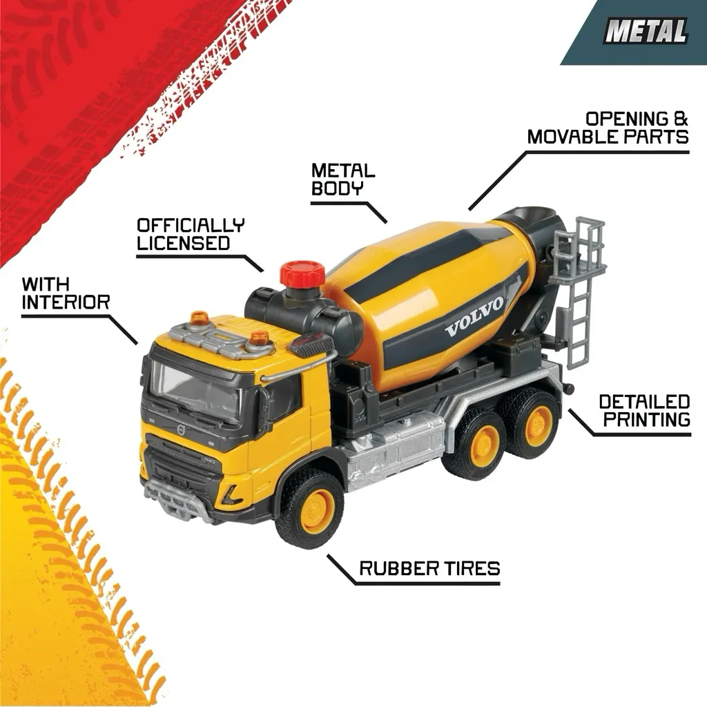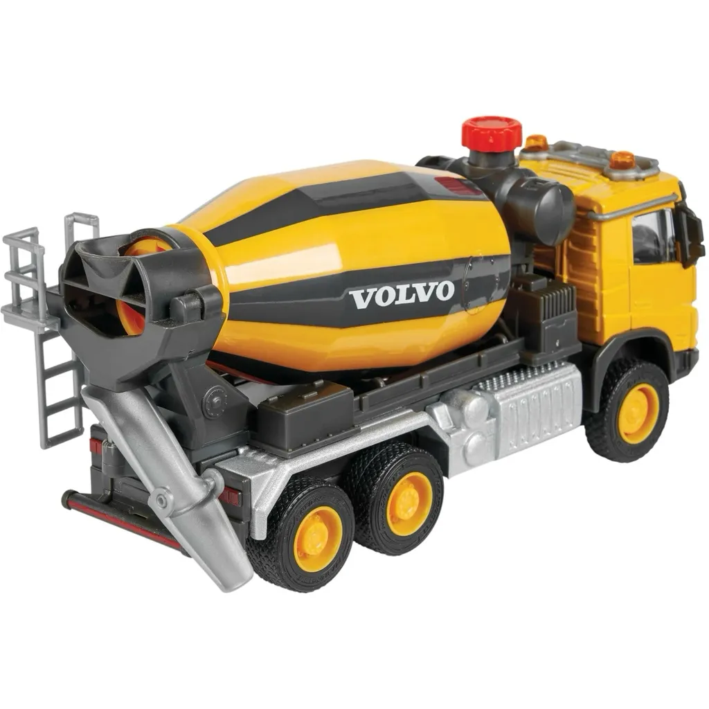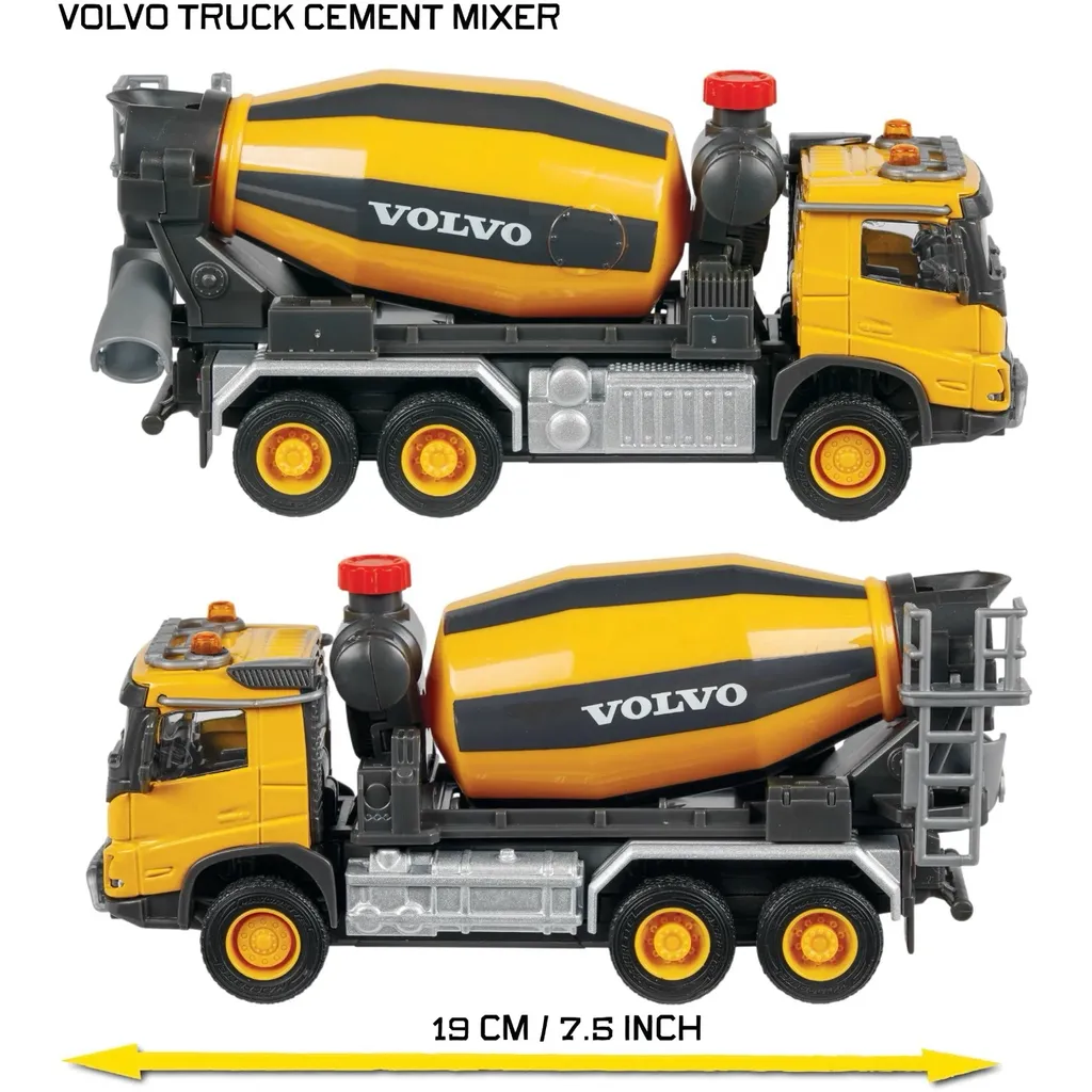 Gul cementbil eller betonbil i form af en Volvo FMX fra Majorette i deres serie af større køretøjer, Majorette Grand Series. Cementbilen er 19 cm høj.