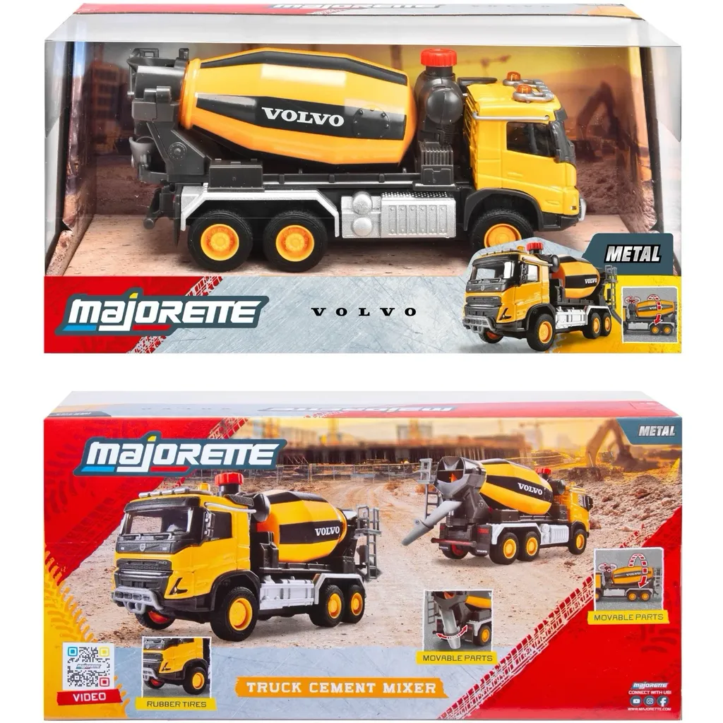 Gul cementbil eller betonbil i form af en Volvo FMX fra Majorette i deres serie af større køretøjer, Majorette Grand Series. Cementbilen er 19 cm.