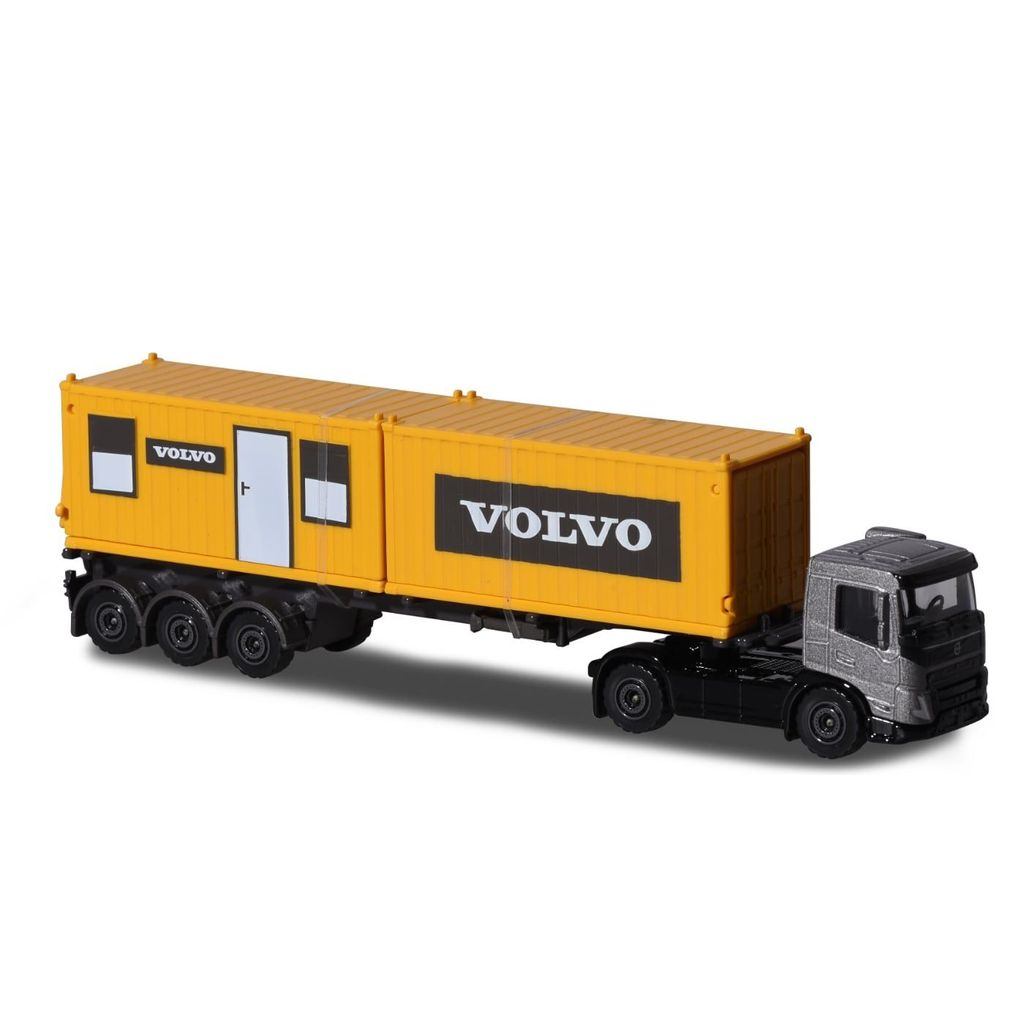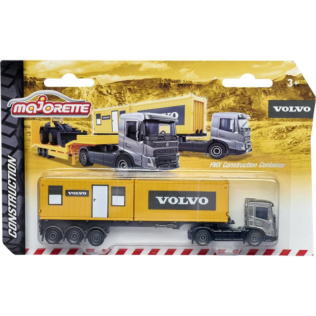Majorette metaltraktor med plastdele af høj kvalitet. Denne Volvo-traktor har en anhænger med to containere. Sættet hedder FMX Construction Container. Containerne er aftagelige og kan åbnes.